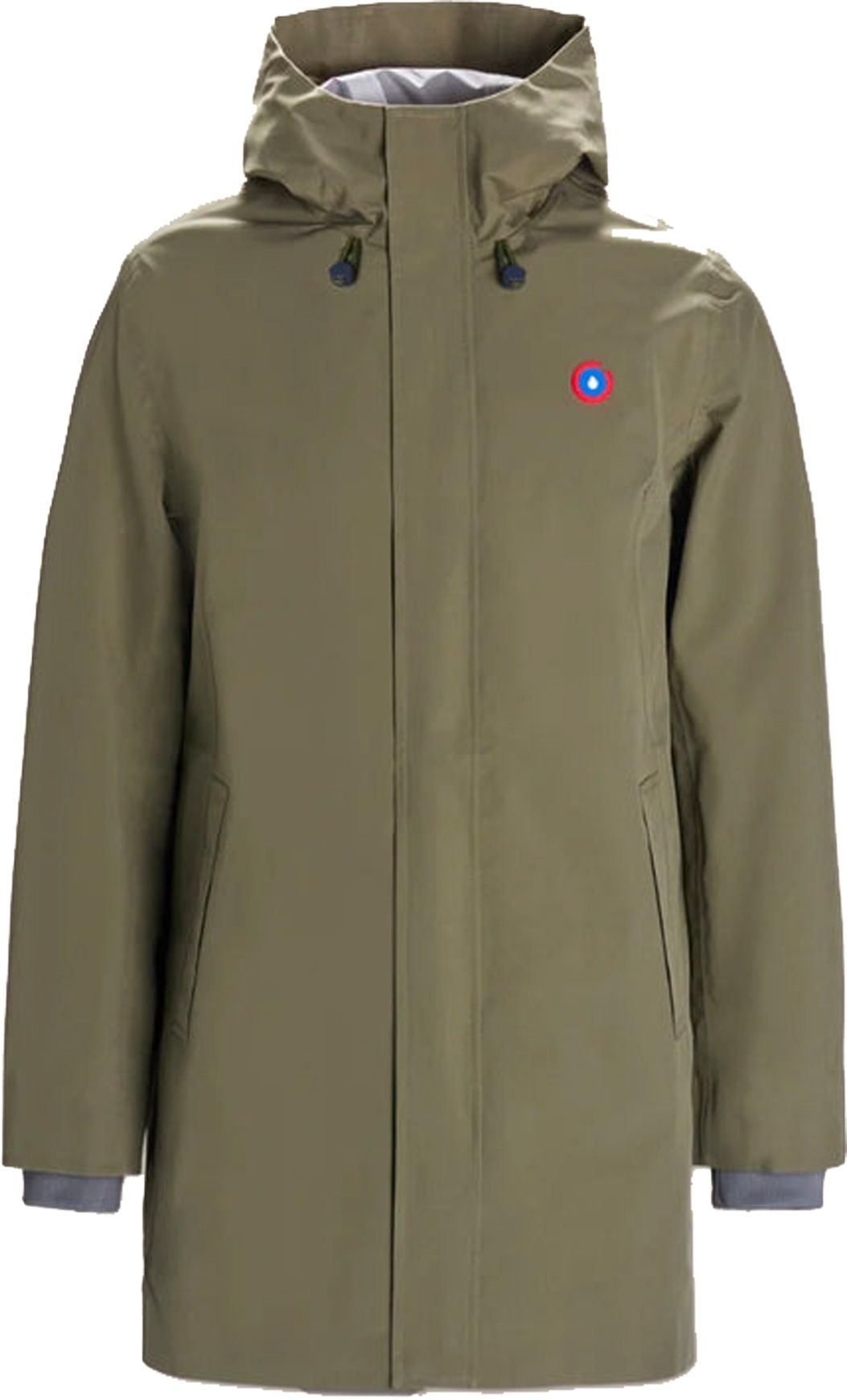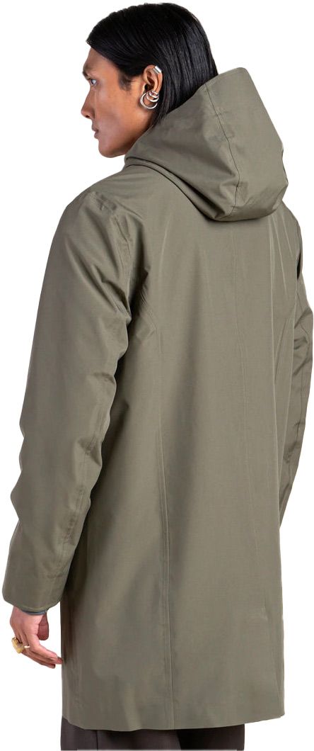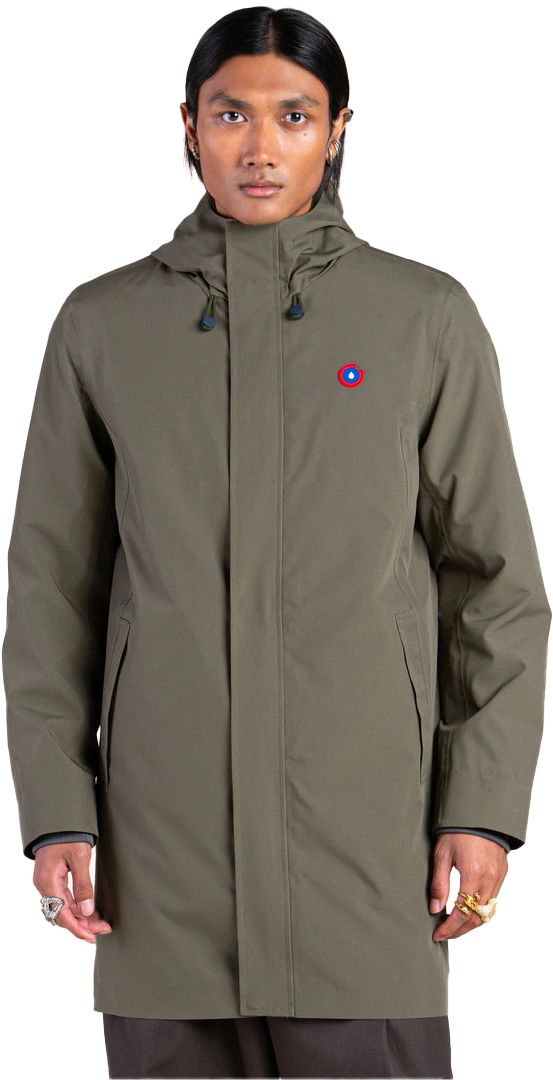 Veste longue Flotte Beaubourg Kaki unisexe en matériaux recyclés, totalement imperméable avec coutures scellées, poches zippées et ceinture ajustable pour un hiver au chaud et au sec.