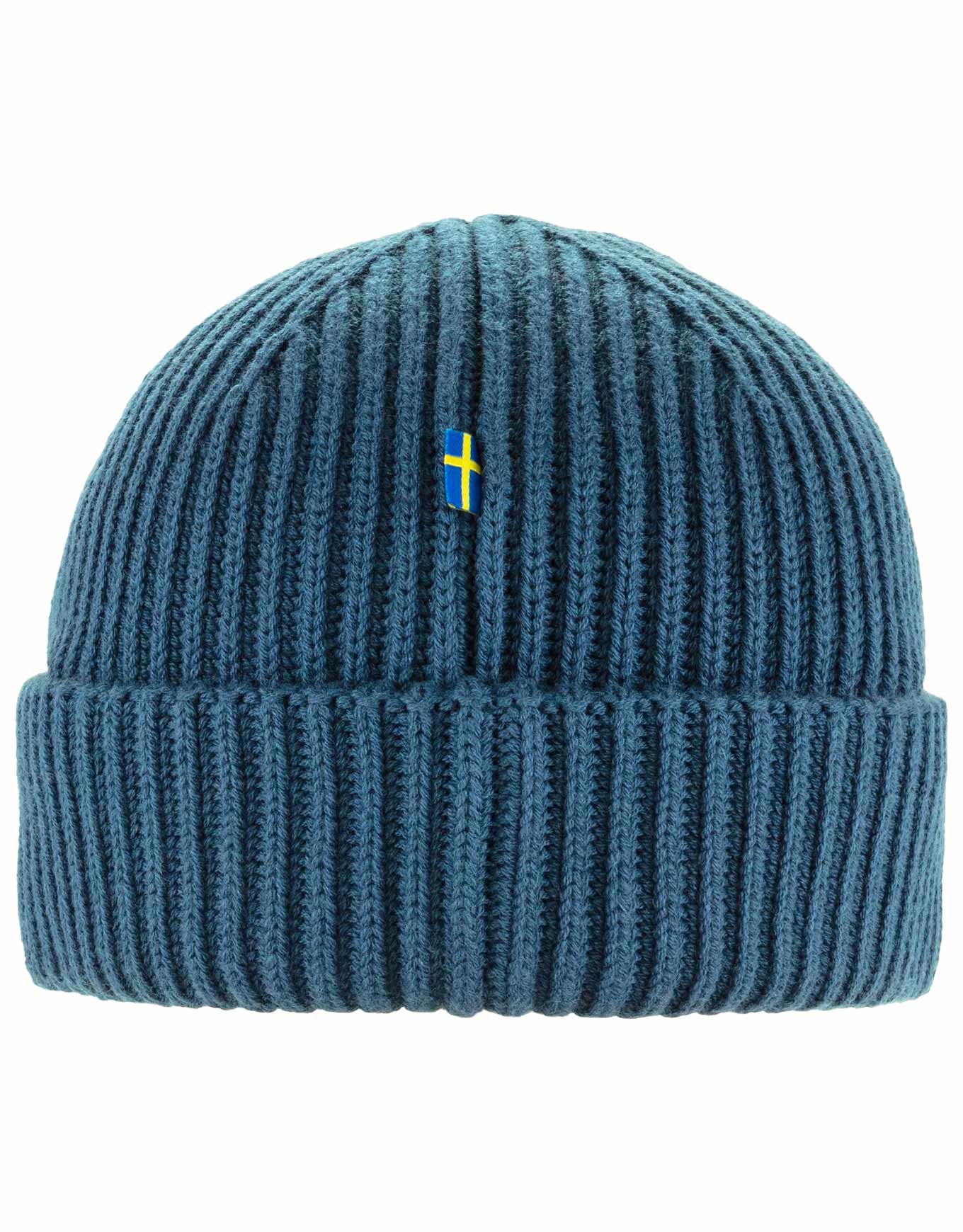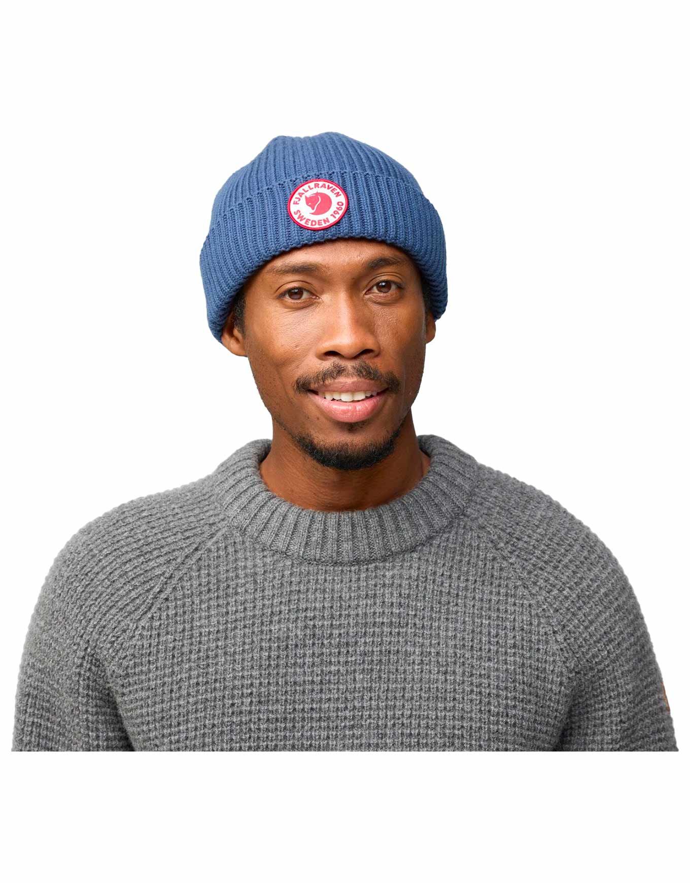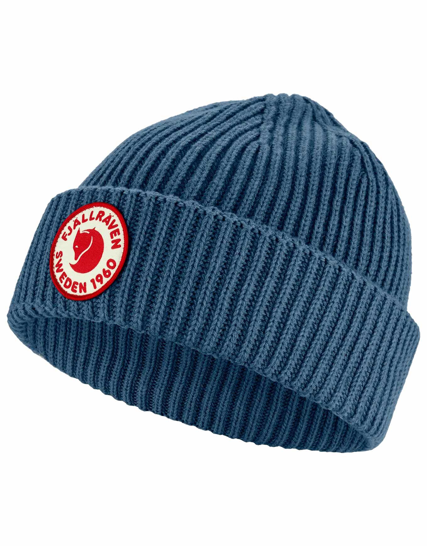 Bonnet 1960 Lite Logo Hat Indigo Blue de Fjällräven en laine mérinos et coton bio, coupe courte, revers large, sèche rapidement et tient chaud même humide.