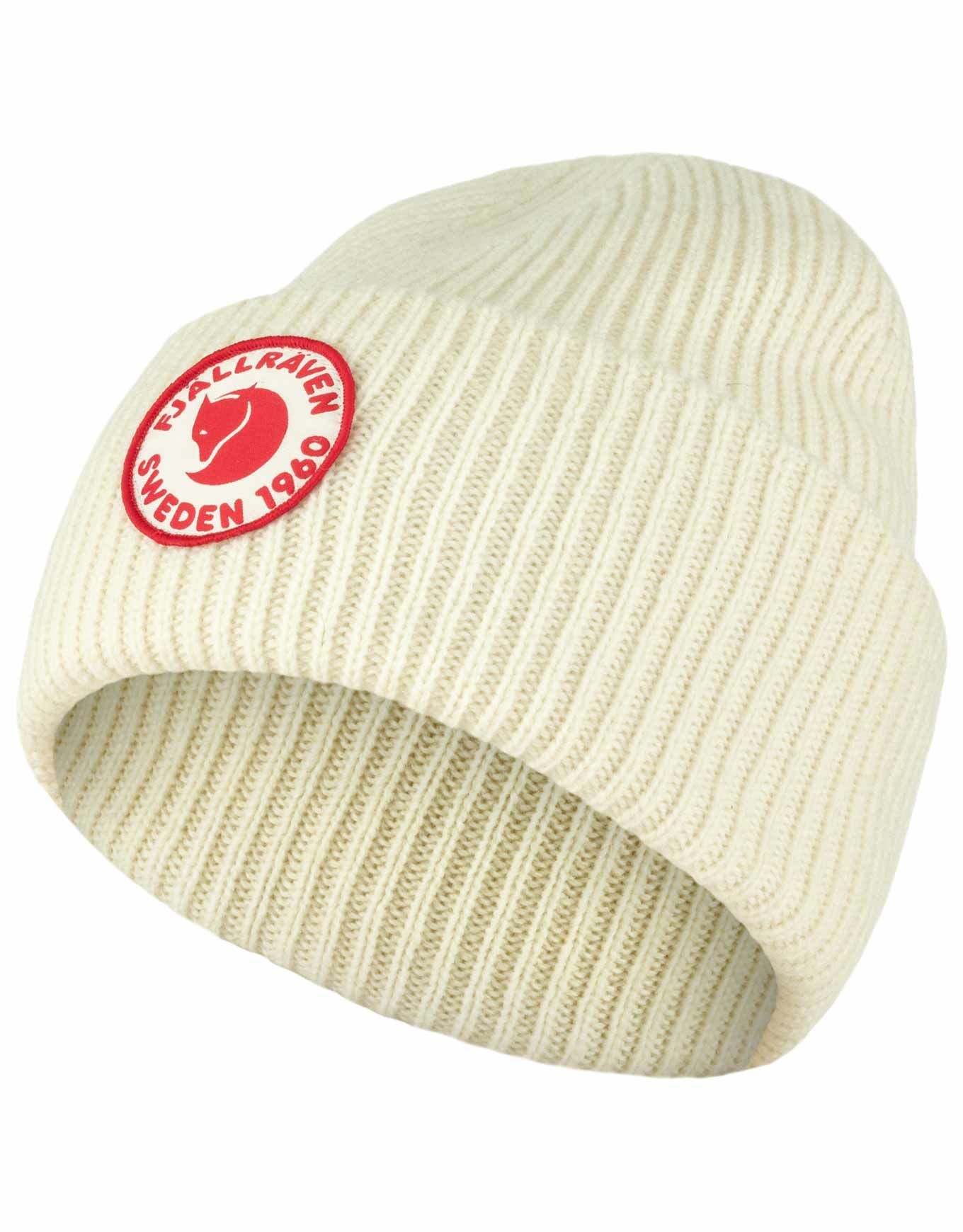 Bonnet Fjällräven 1960 Logo Chalk White unisexe en laine mérinos côtelée double épaisseur, doux, robuste et chaud pour l’hiver, logo brodé.