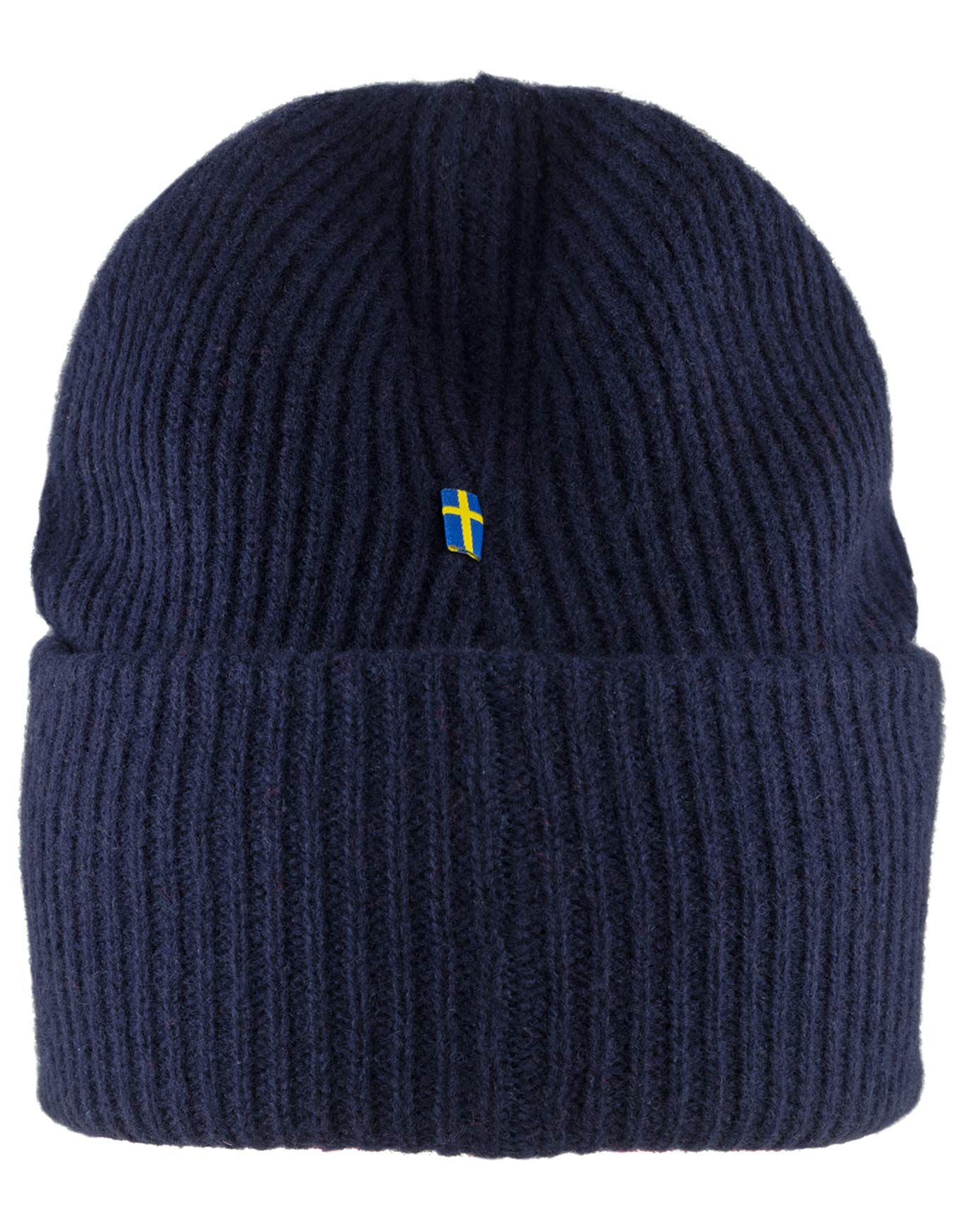 Bonnet Fjällräven 1960 Logo Dark Navy en laine mérinos côtelée double épaisseur, chaud et doux pour l’hiver, logo brodé devant, unisexe.