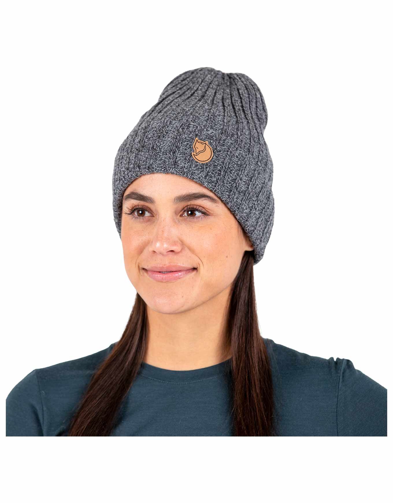 Bonnet Byron Black Fjällräven en laine 100 %, unisexe, chaud et isolant, design revers et maille côtelée, ville ou montagne.
