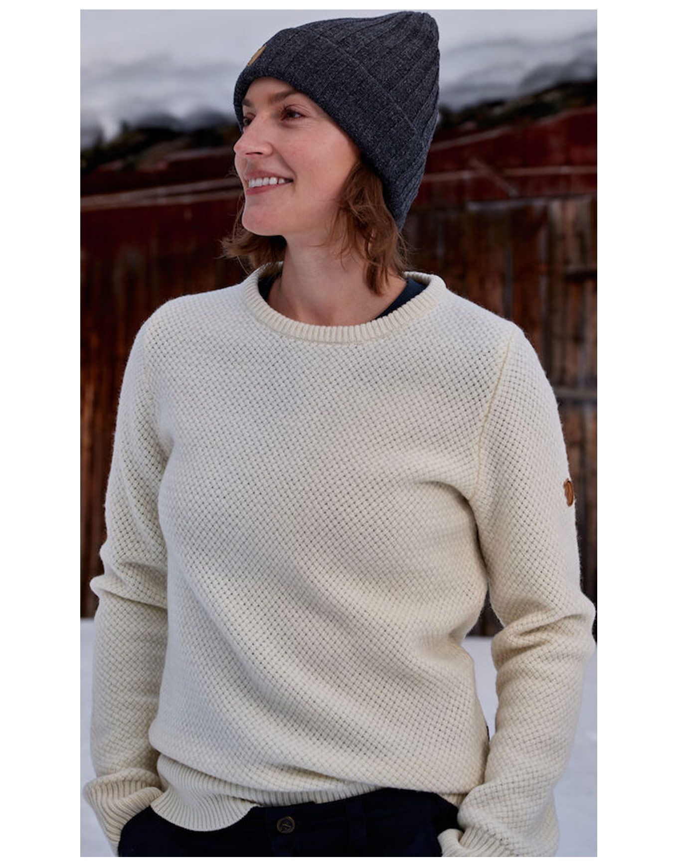 Bonnet Byron Graphite unisexe Fjällräven en laine 100 %, chaud et isolant, design à revers et maille côtelée pour la ville ou la montagne.