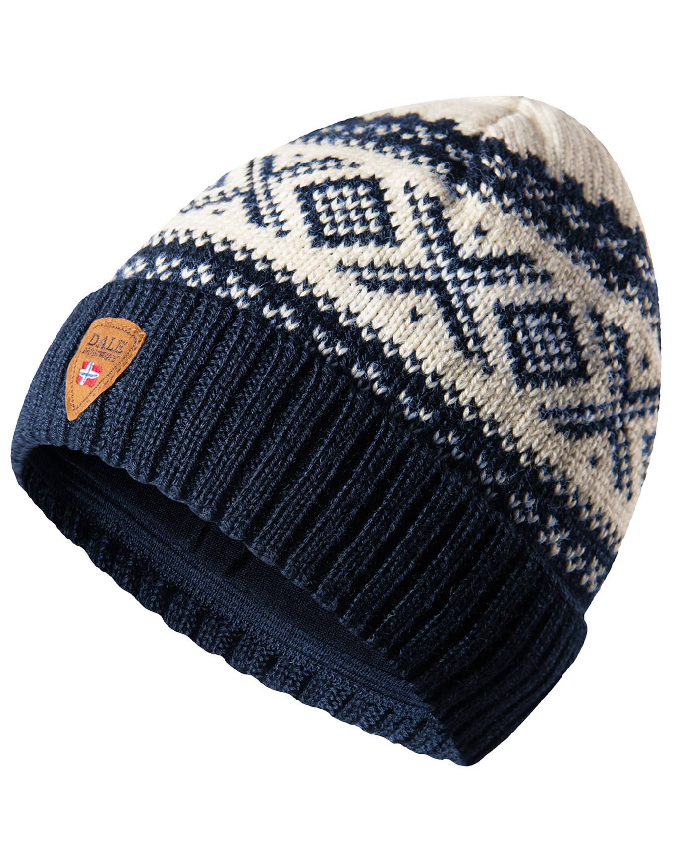 Bonnet à revers Cortina 1956 Navy White unisexe Dale of Norway, 100 % laine norvégienne doublée mérinos, motif traditionnel, chaleur et style en balade ou au ski.