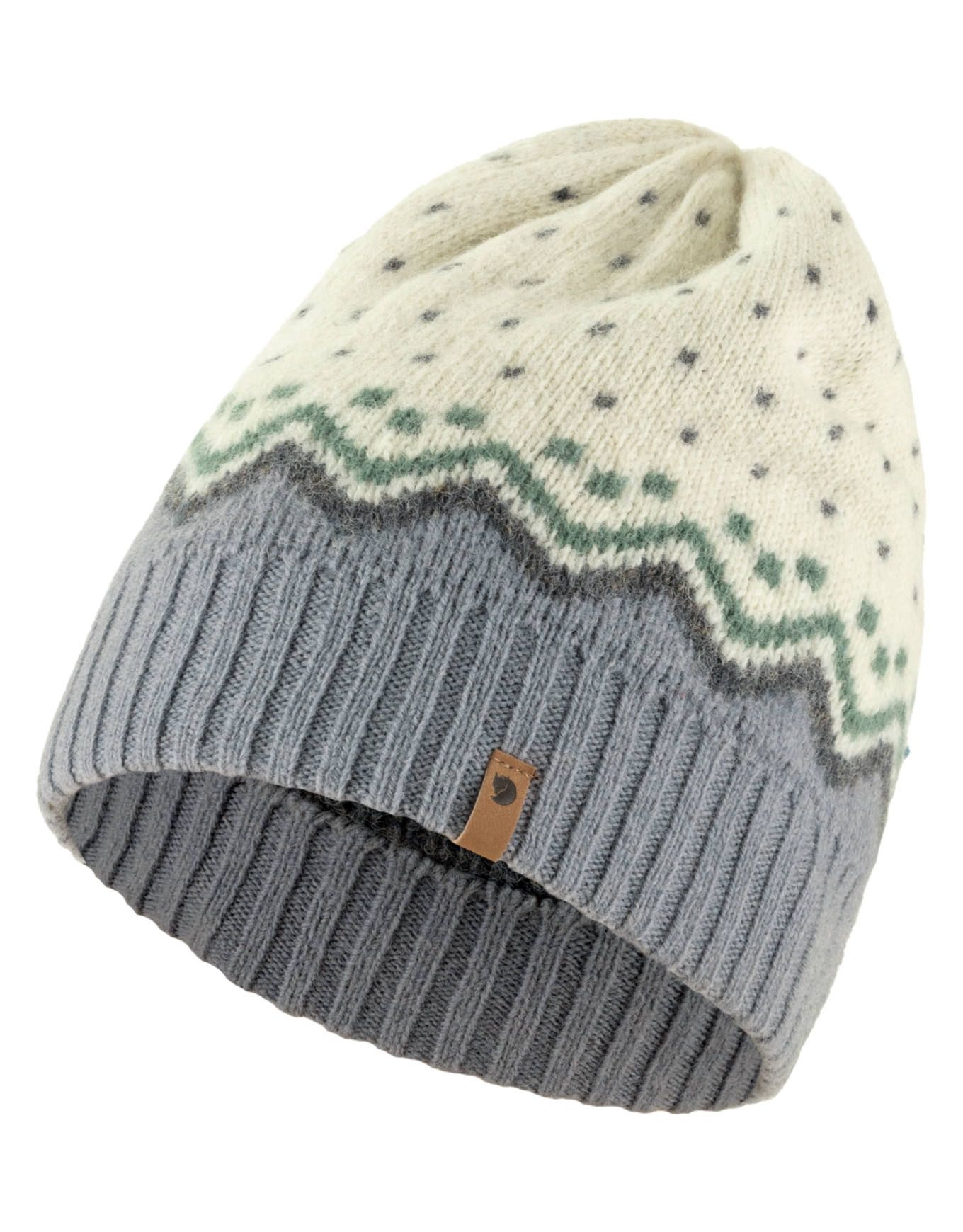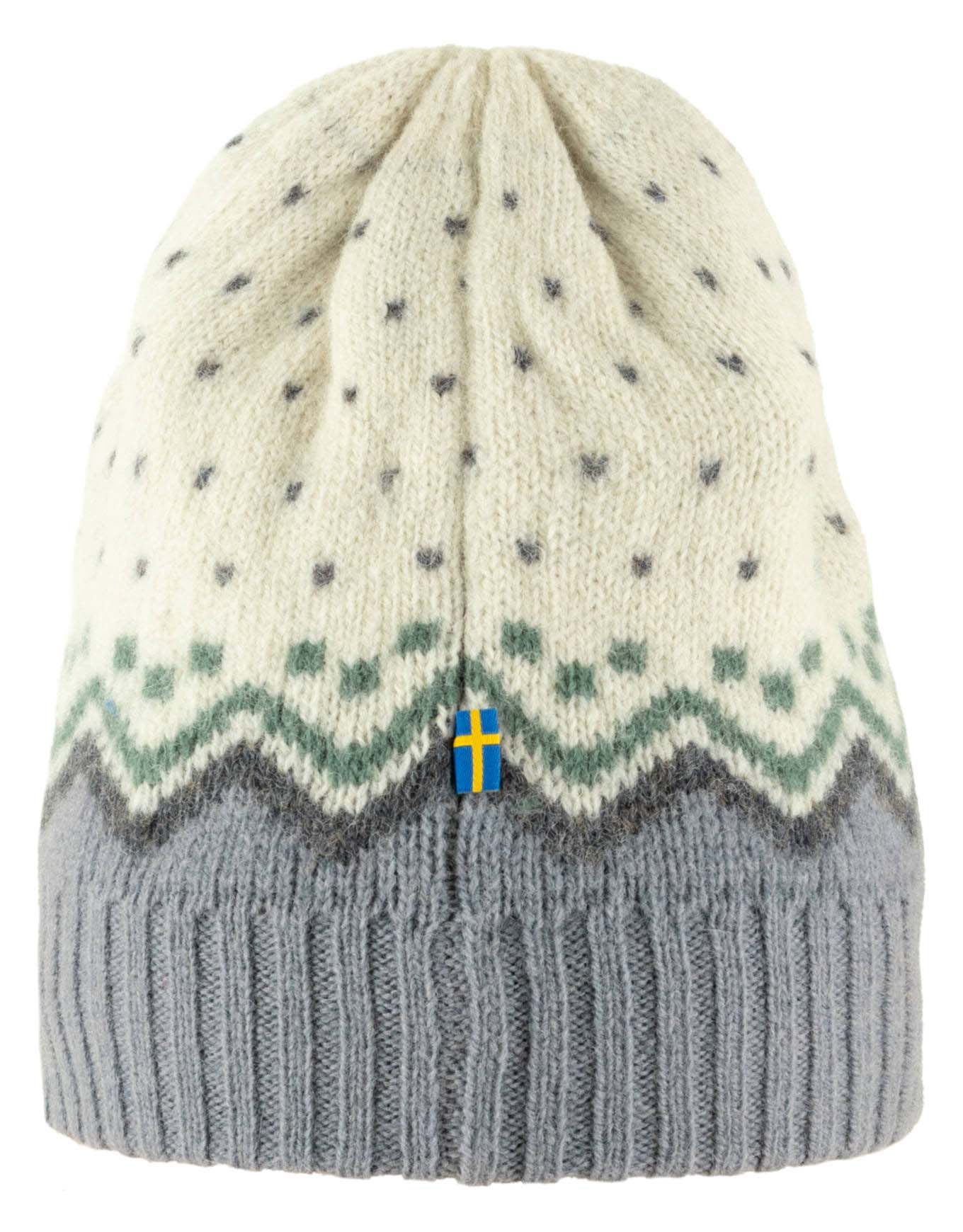 Bonnet unisexe Övik Knit Chalk White de Fjällräven en laine 100 % moelleuse et traçable, côtelé avec motifs jacquards nordiques pour chaleur urbaine ou alpine.