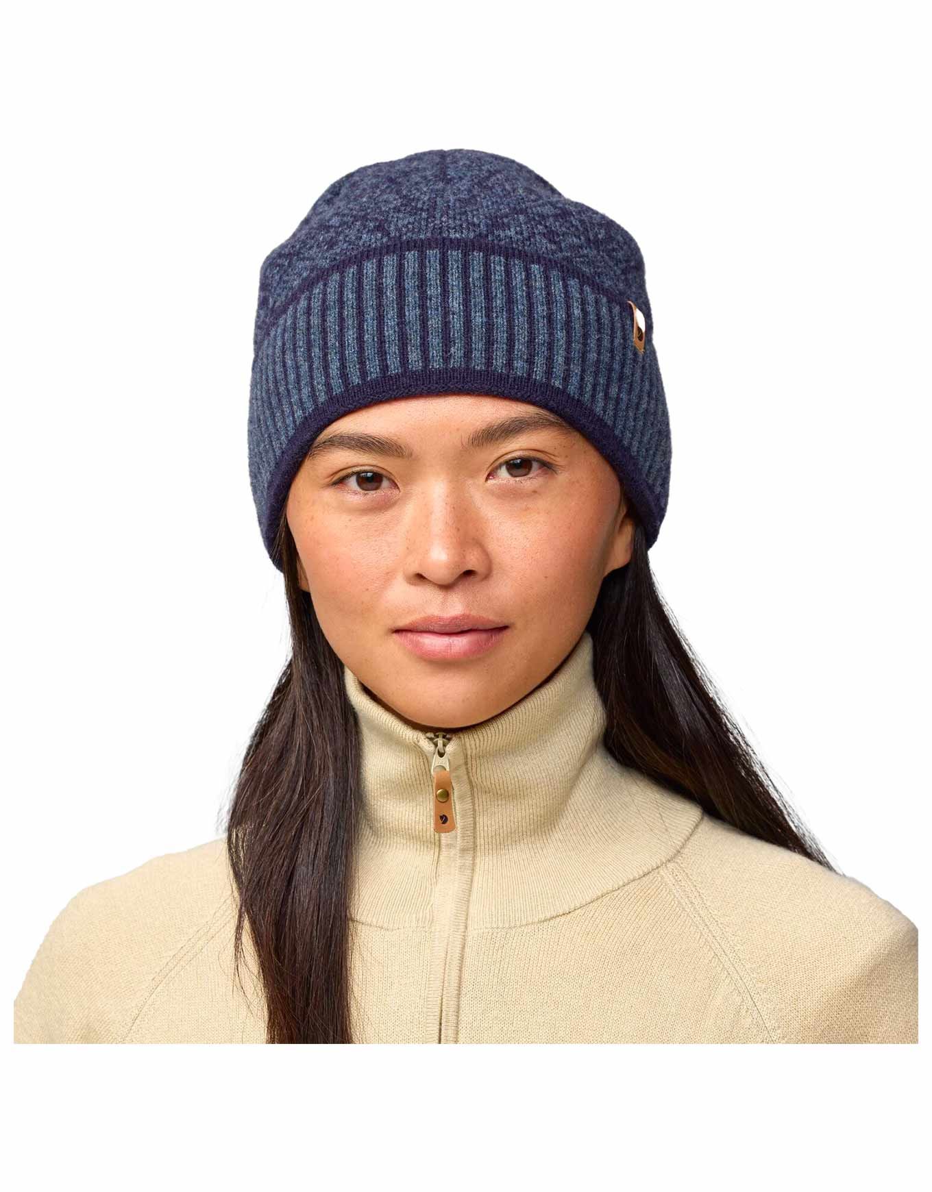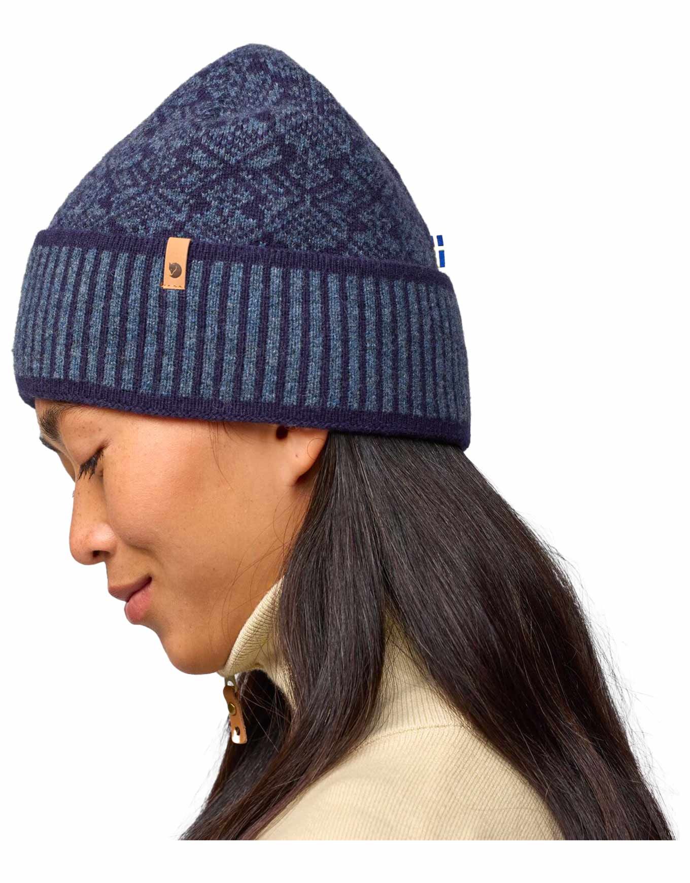 Les codes graphiques du célèbre Snow Cardigan Fjällräven inspirent son motif, puisant dans le folklore scandinave. On note une finition soignée avec des coutures plates, un ourlet côtelé replié, ainsi qu’un petit logo cuir discrètement appliqué sur le côté pour une note authentique.