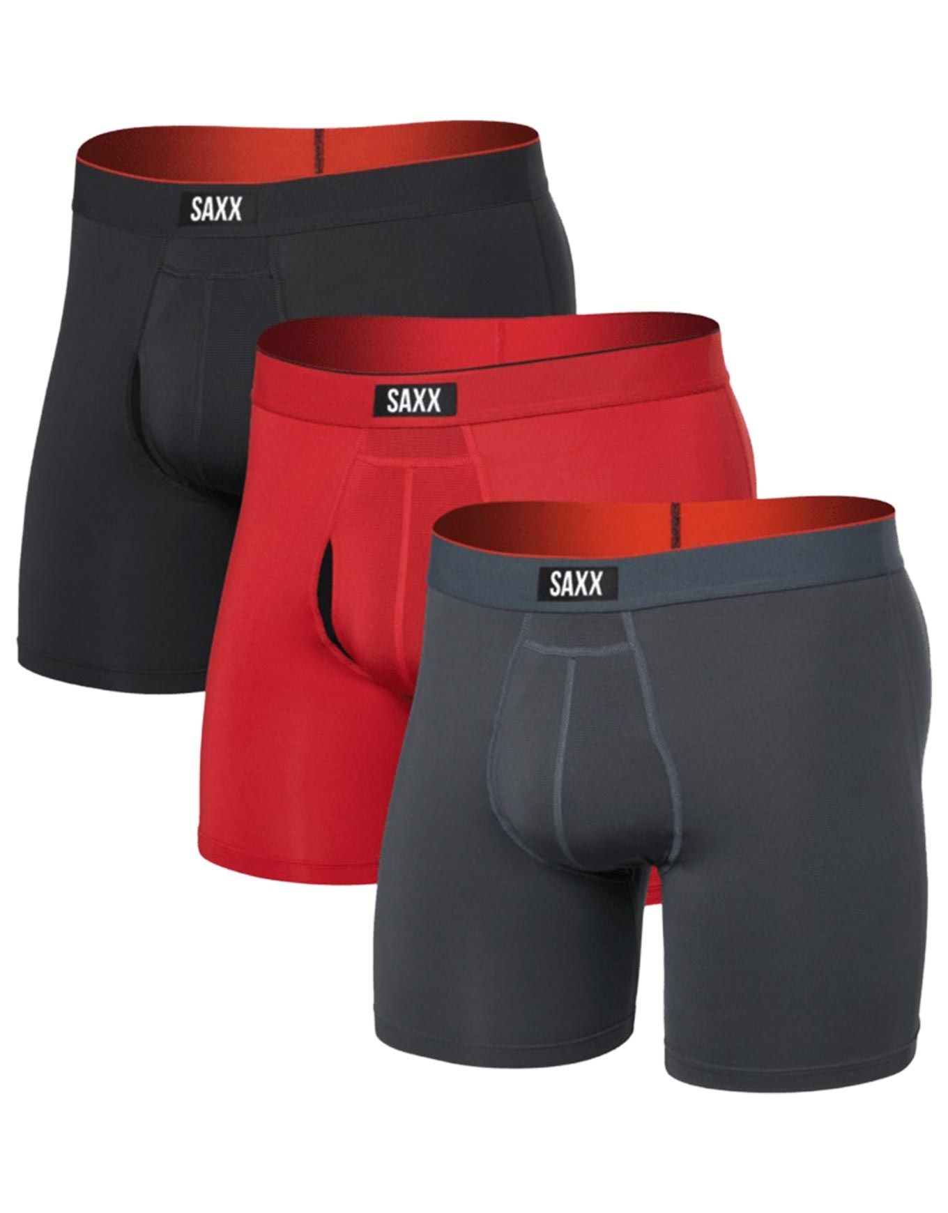 Saxx Underwear Multi-Sport Mesh 3Pk Sunset Red/Trblnce/FD Blk : pack de 3 boxers techniques homme en mesh ultra-respirant et séchage rapide, jambe fixe sans remontée, coutures plates Flat Out Seams™, Three-D Fit™ et poche BallPark Pouch™PRO pour un confort sans frottement.