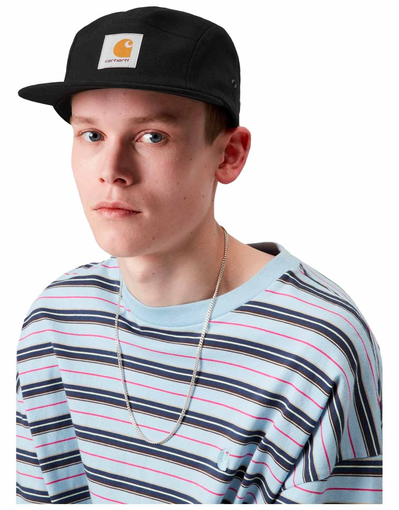 Casquette unisexe Backley Cap Black Carhartt WIP, 5 panneaux en coton, visière plate et œillets d’aération pour un confort respirant et un style décontracté adaptable à toutes les tenues.