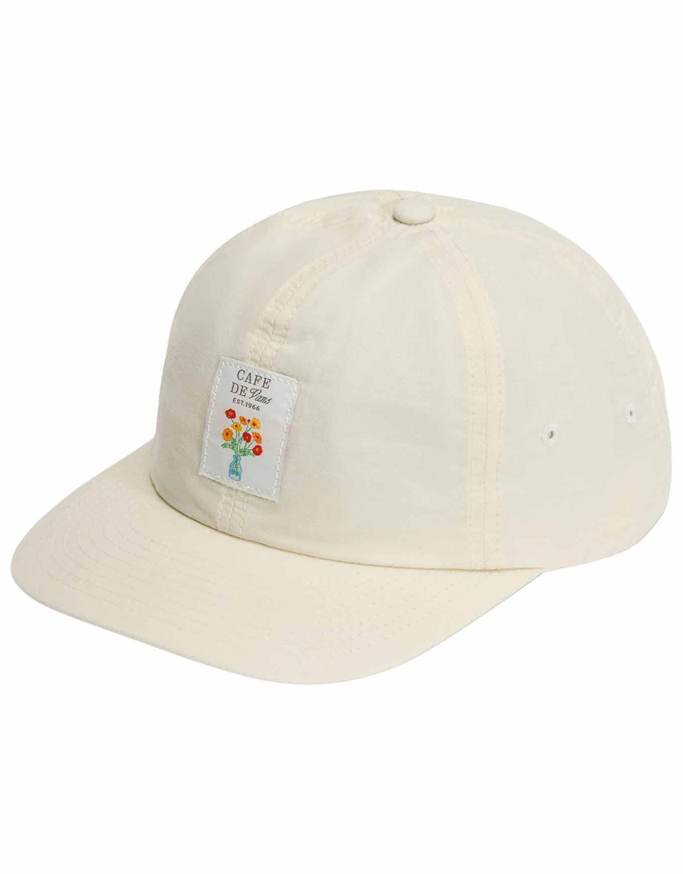 Cafe Vans Jockey Hat Marshmallow est une casquette 6 panneaux à visière plate en coton-nylon EOD, légère et aérée pour un confort quotidien.