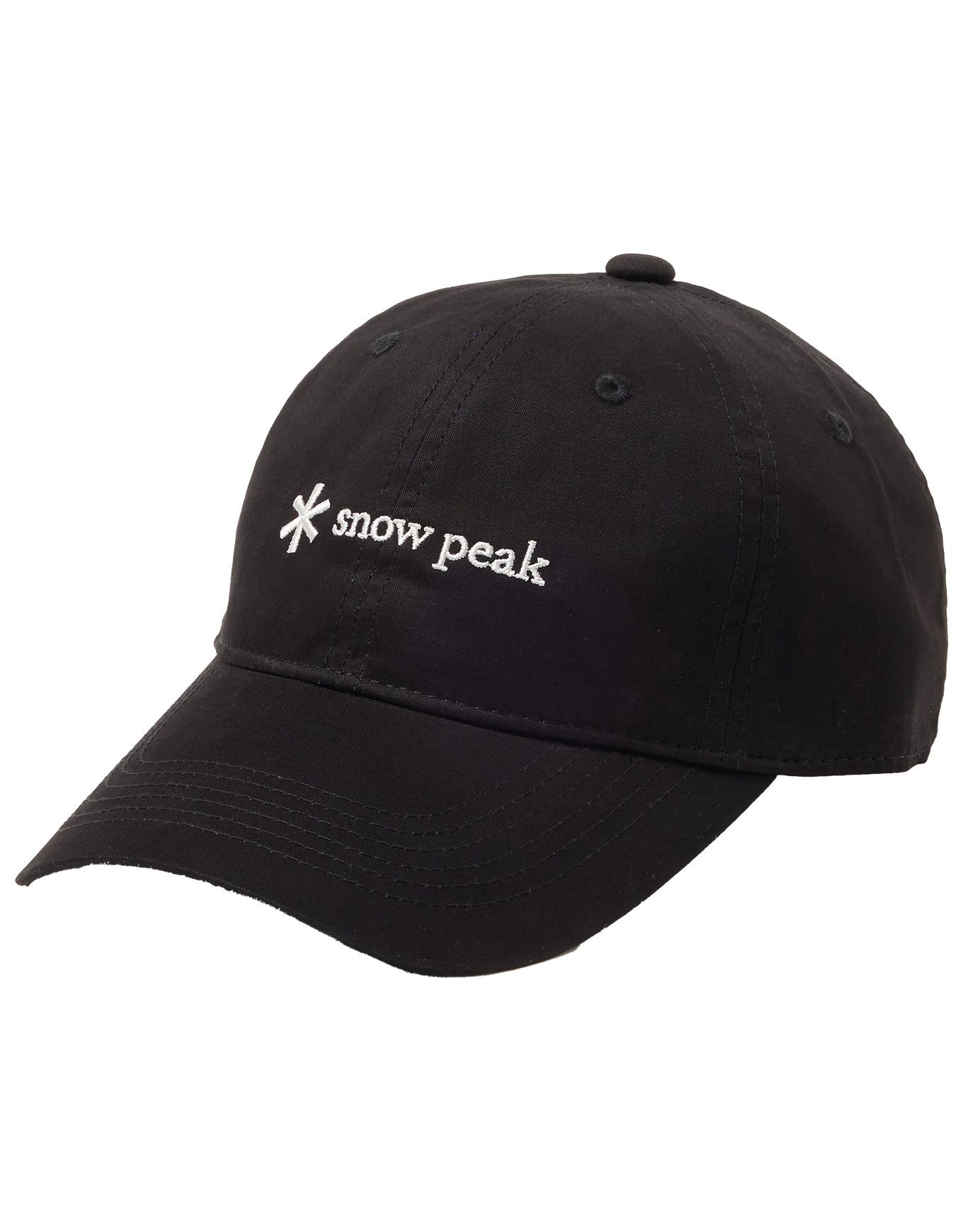 Casquette Snow Peak NSD Logo Cap Black unisexe en sergé 100 % coton, 6 pans, logo brodé, bord renforcé et réglage arrière pour tenue stable et style urbain sobre.