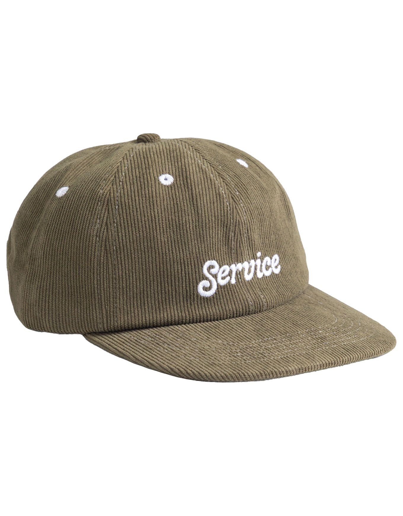 Service Works Service Script Cord Cap Forest est une casquette en coton côtelé à 6 panneaux, visière plate et élastique arrière pour un ajustement stable ; motif sérigraphié frontal, look décontracté.