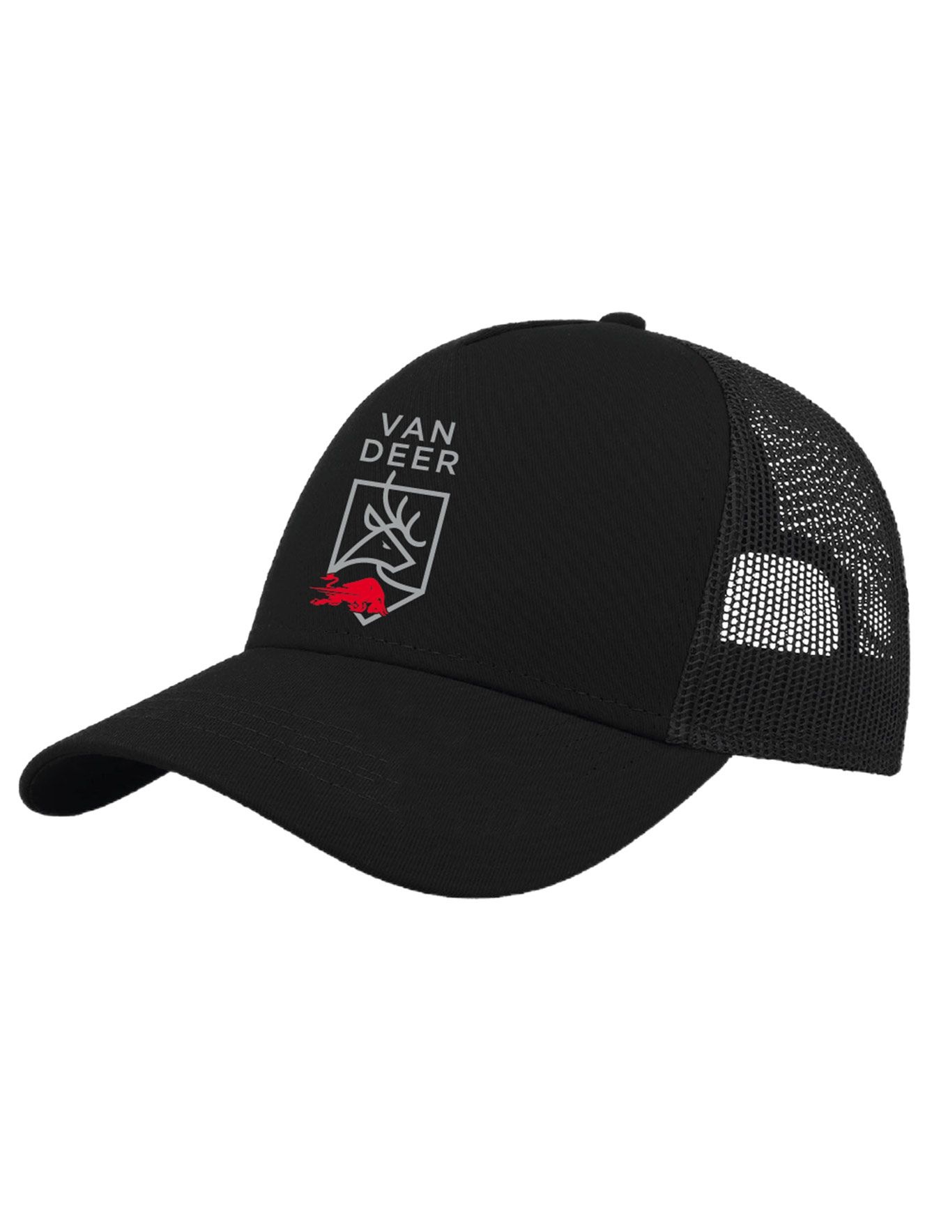 Van Deer Trucker Cap Osfa Black : casquette unisexe en coton, visière courbée, imprimé 3D et panneau arrière en maille ventilée pour un confort optimal sans surchauffe.