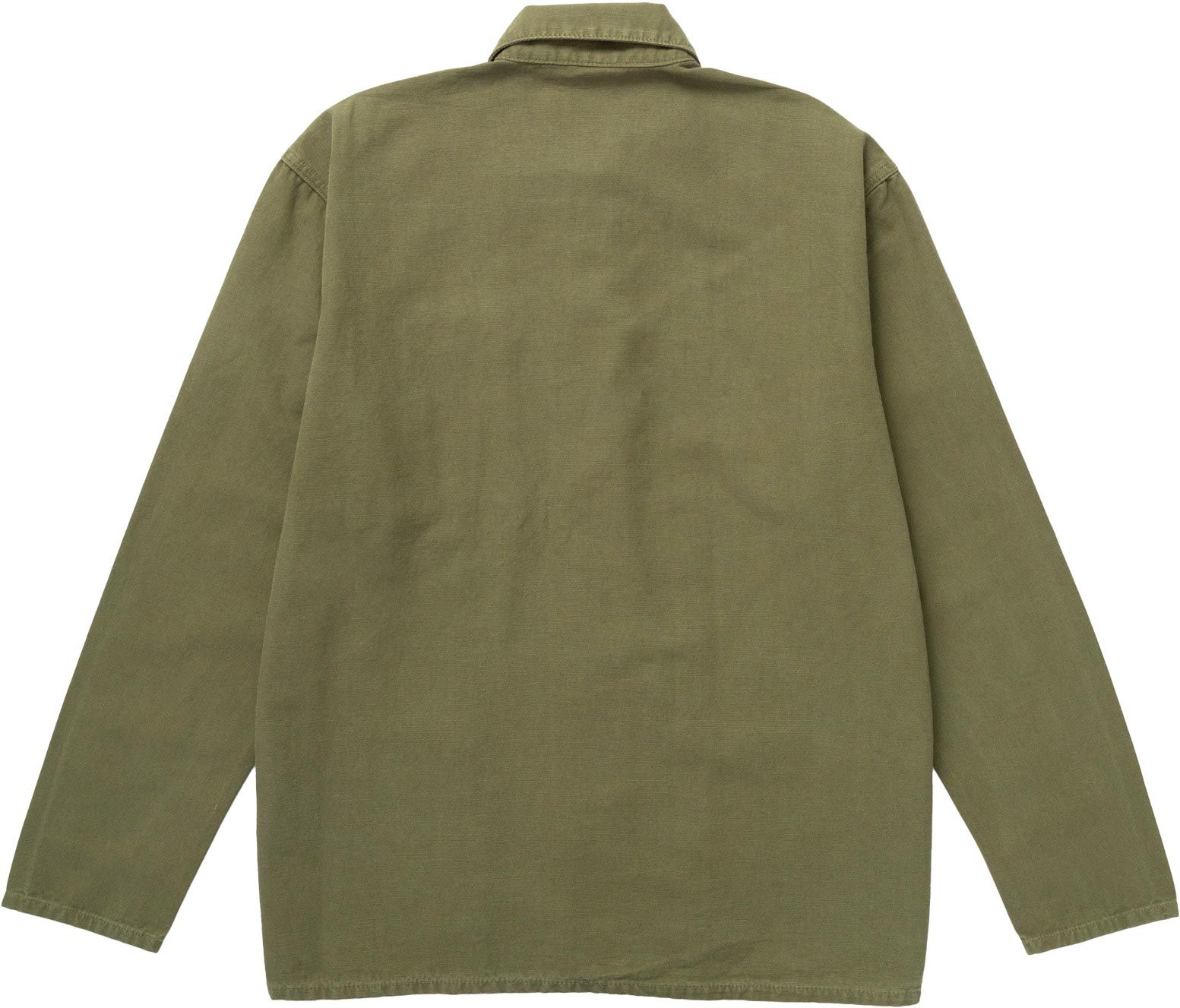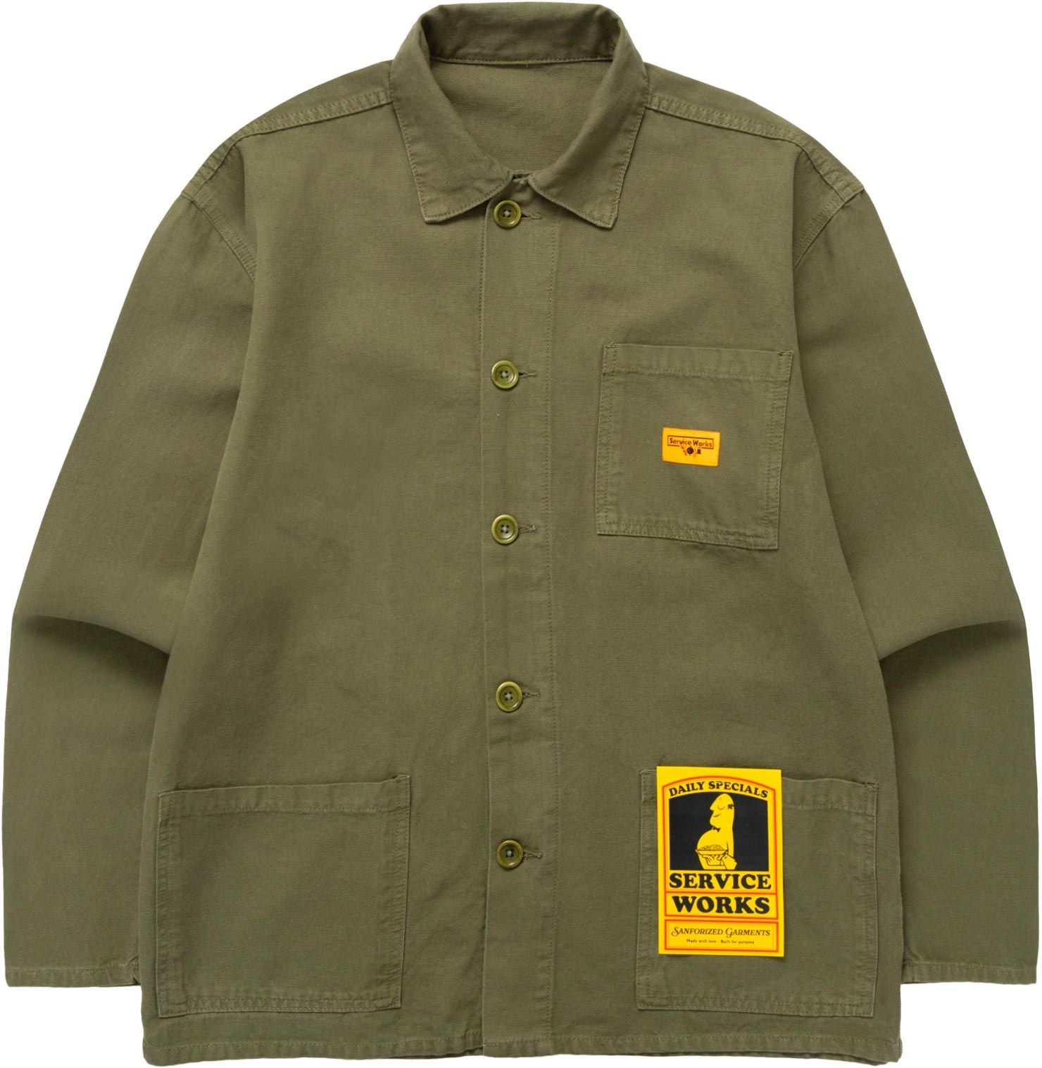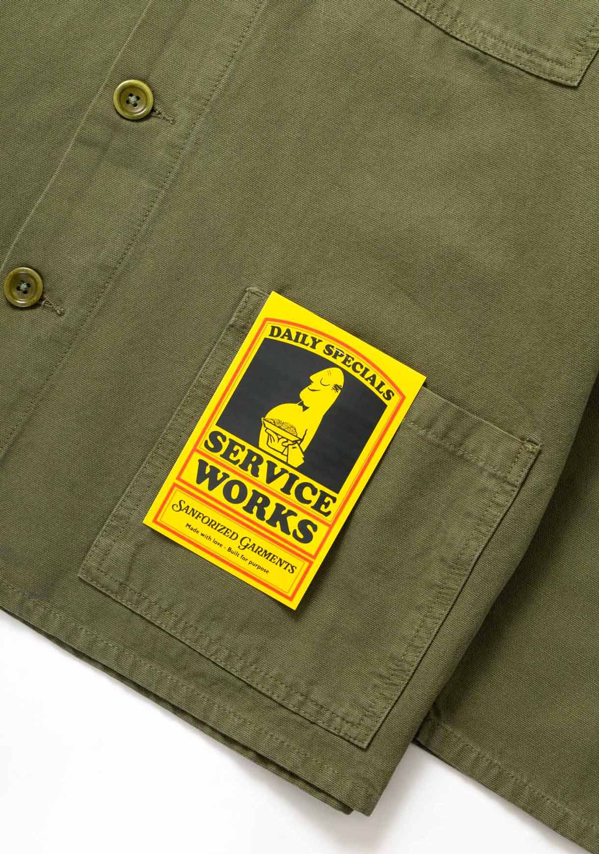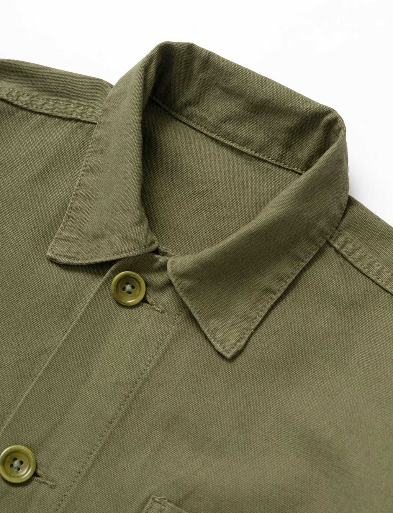 La chemise Canvas Chore Olive de Service Works, en coton biologique GOTS™, conjugue robustesse et esprit utilitaire avec ses trois poches avant, sa patte à cinq boutons et sa poche poitrine intérieure discrète.