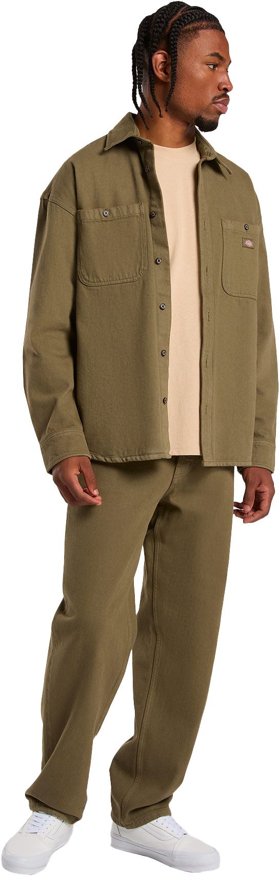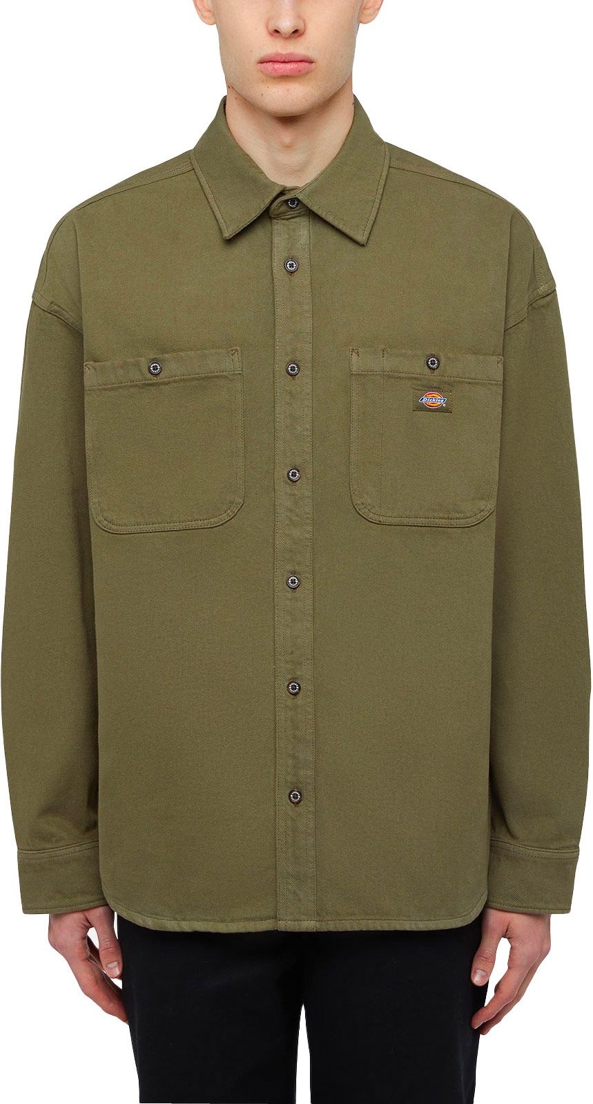 Chemise à manches longues Dickies Houston LS Shirt Military Green pour homme, en denim léger 100 % coton, coupe décontractée, poches poitrine boutonnées et ourlet arrondi pour un style casual intemporel.