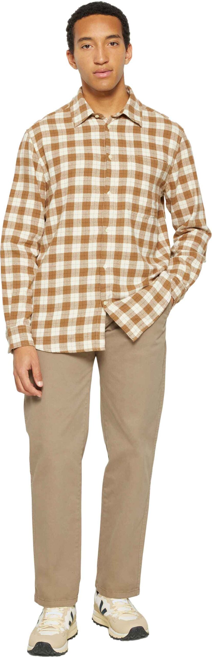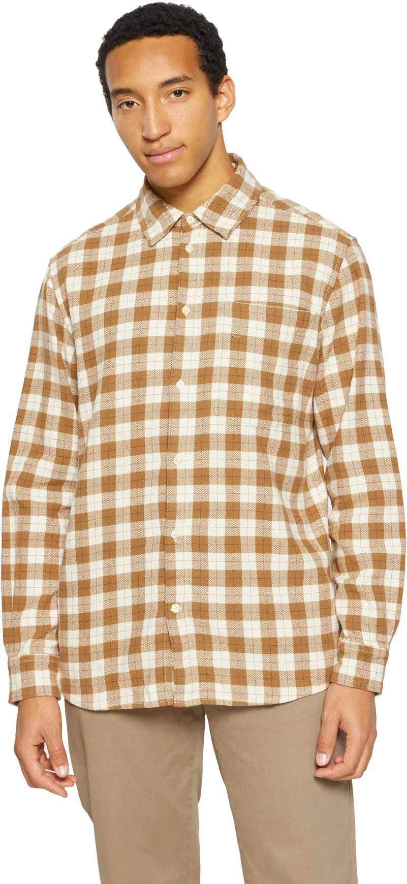 Chemise KnowledgeCotton Apparel Loose Fit Checkered Shirt Beige Check en coton organique, coupe ample, poche poitrine, manches resserrées, fermeture boutons, douce et légère.