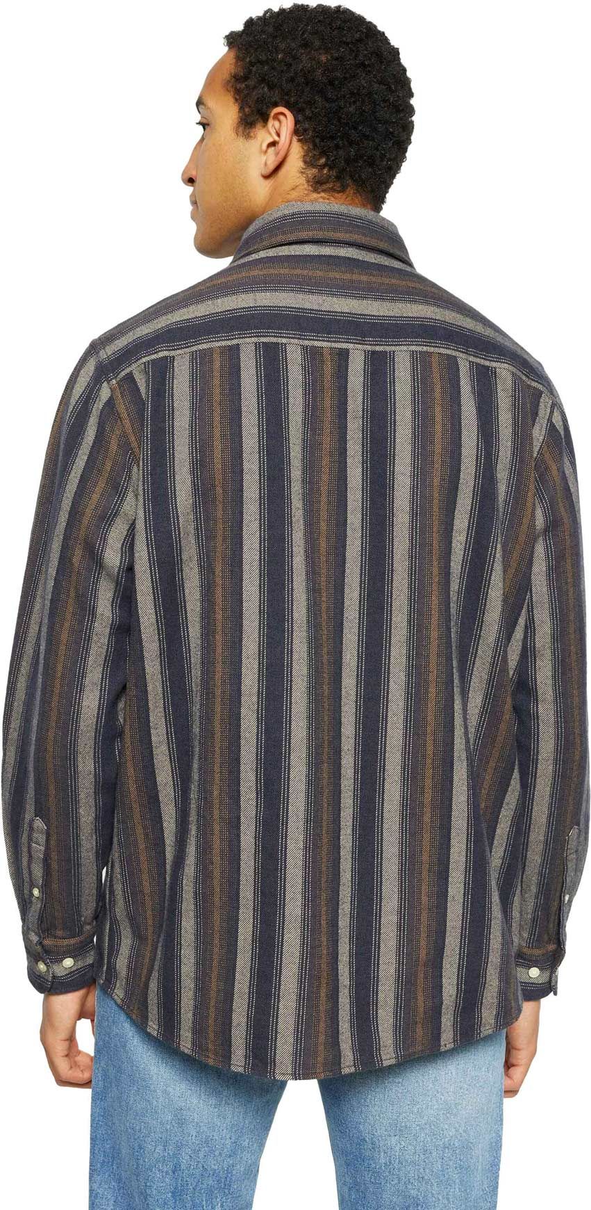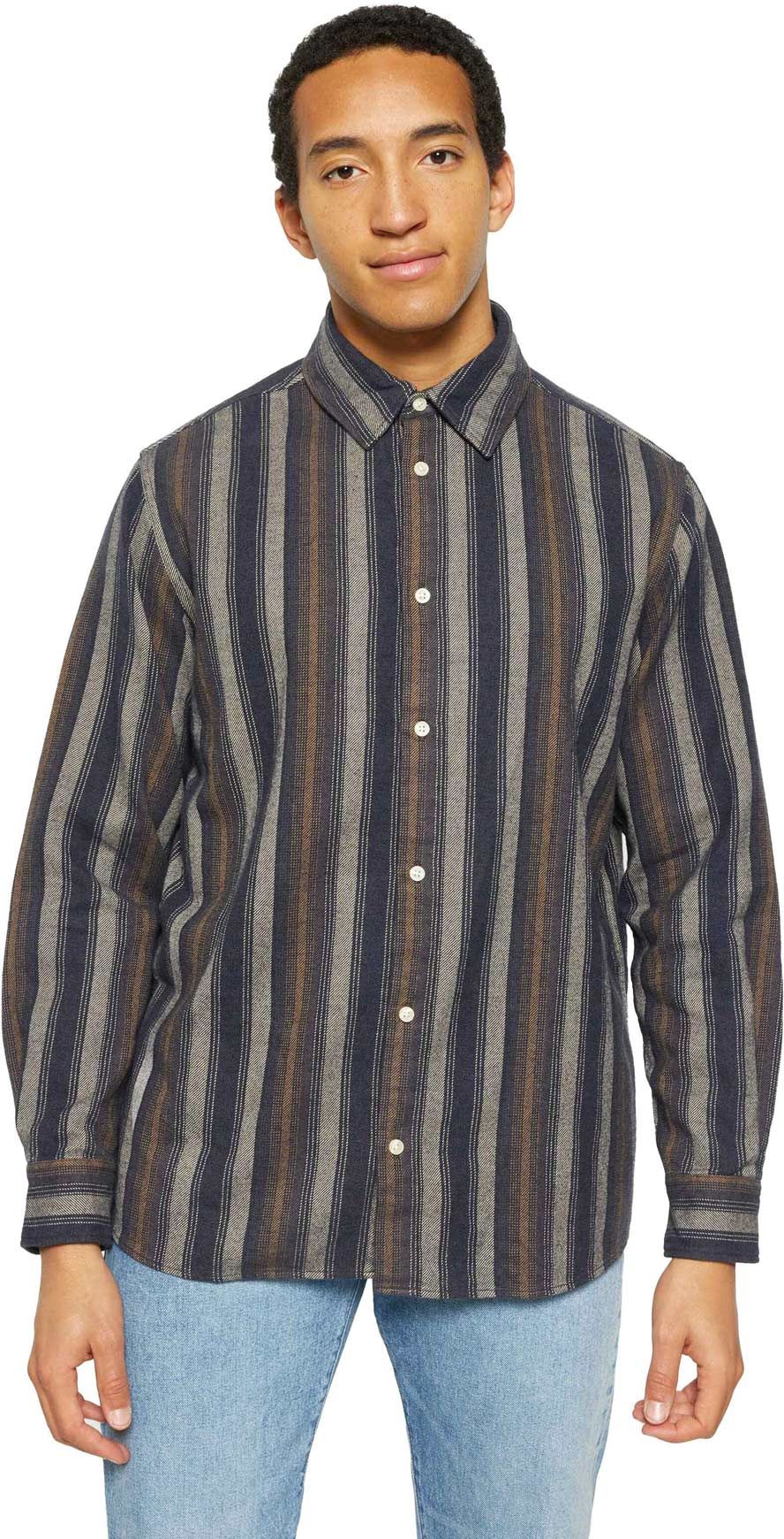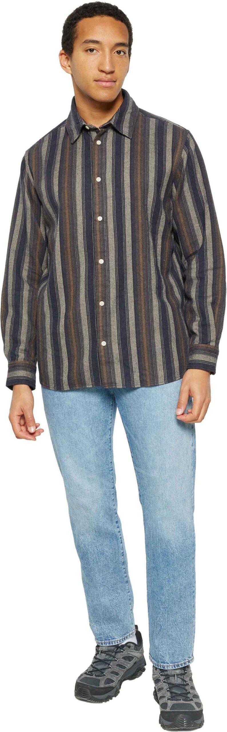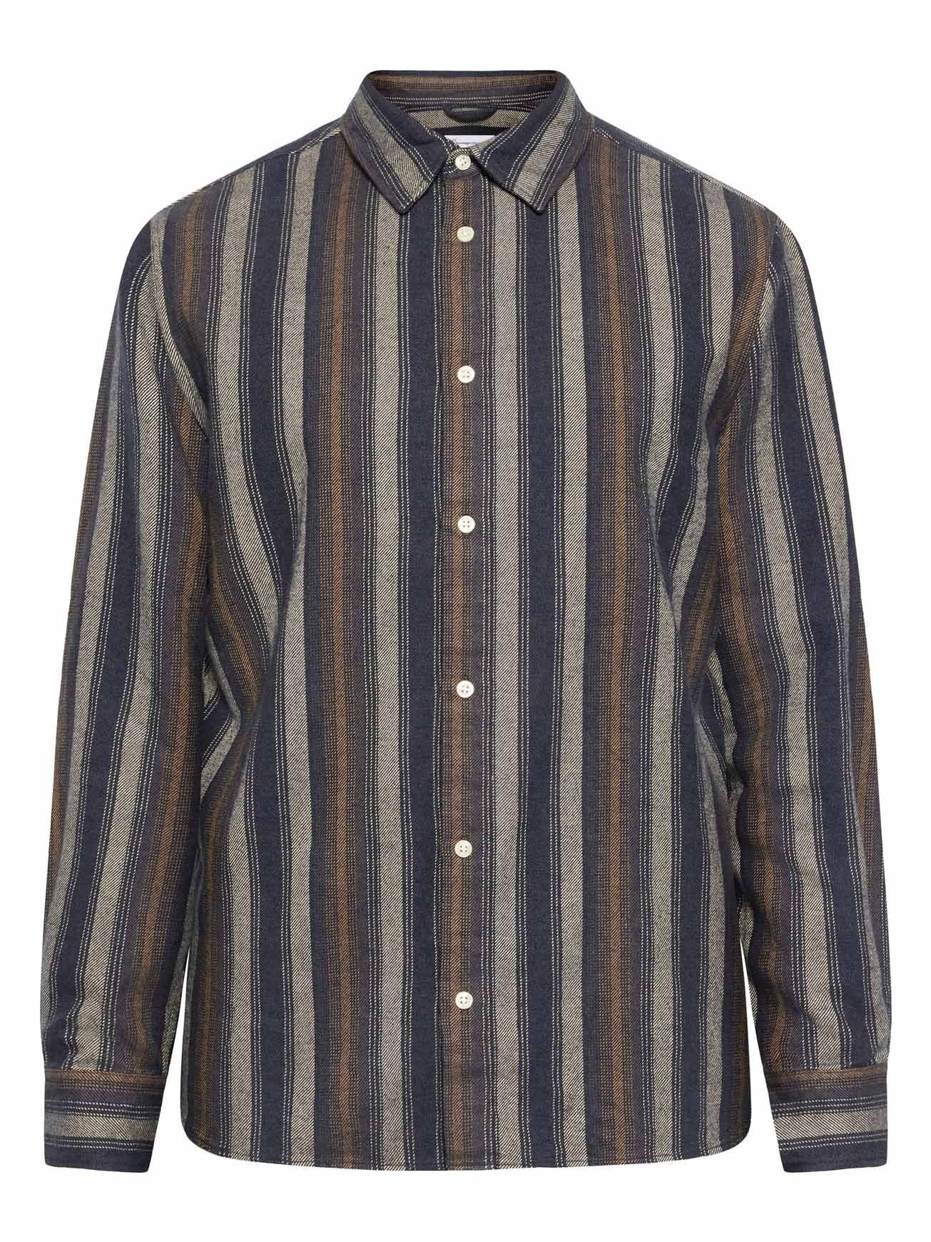 Chemise flanelle Loose Fit Striped Yellow Stripe KnowledgeCotton Apparel, coupe ample en coton bio certifié, col classique et poignets ajustés pour un confort doux tout l’hiver.