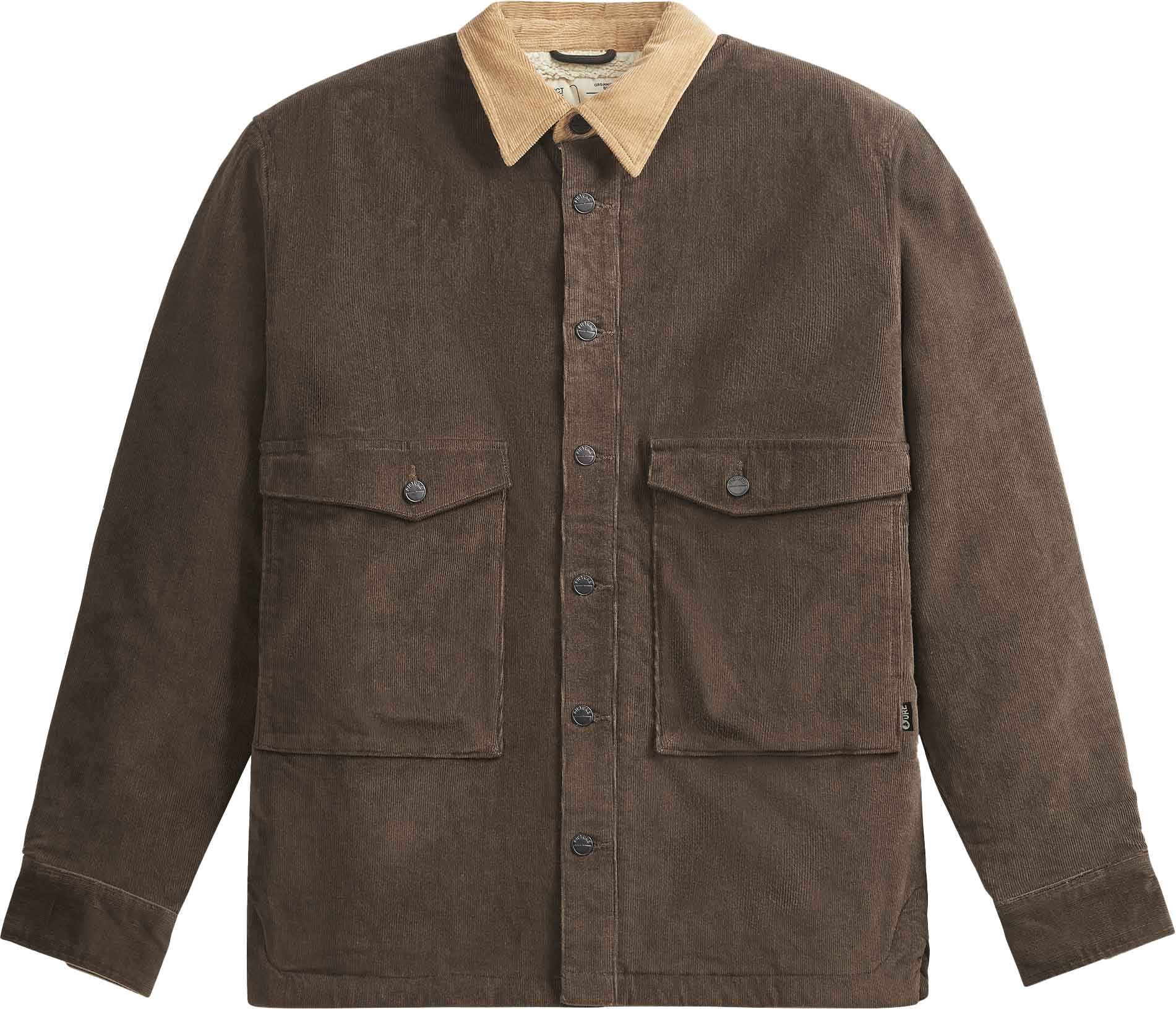 Veste-chemise Noliwa Cord Dark Chocolate Picture Organic Clothing homme en coton biologique, chaude et confortable avec isolation doublée, design bicolore, fermeture boutons-pression, 2 grandes poches, automne-hiver 2023/2024.