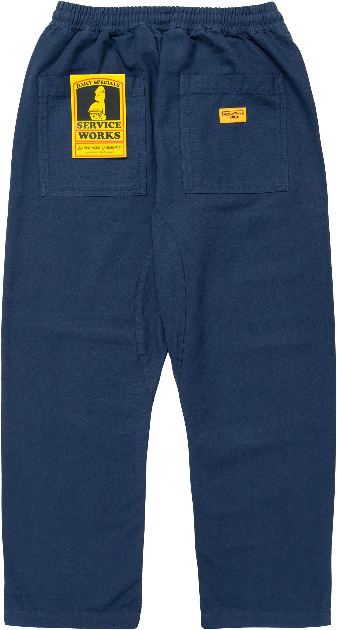 Le Classic Chef Pants Dark Navy de Service Works est un pantalon de cuisine en coton biologique GOTS™, confortable et résistant, avec ceinture élastiquée, entrejambe renforcé et poches cargo surélevées.