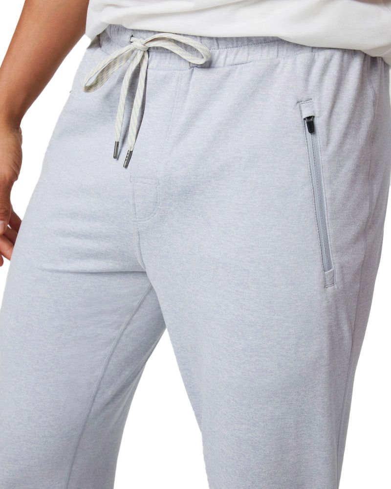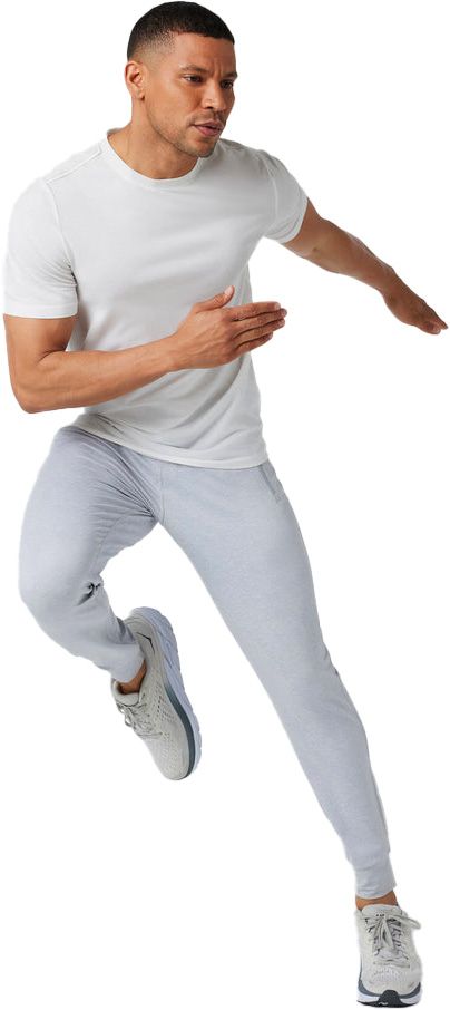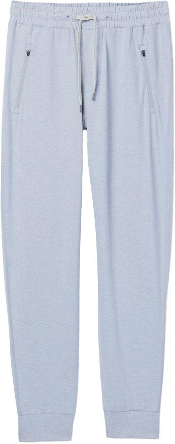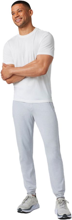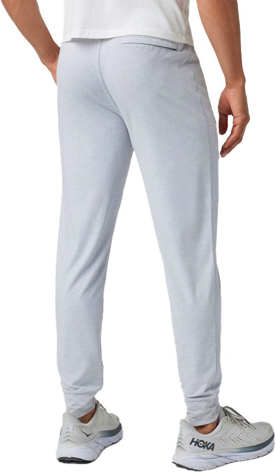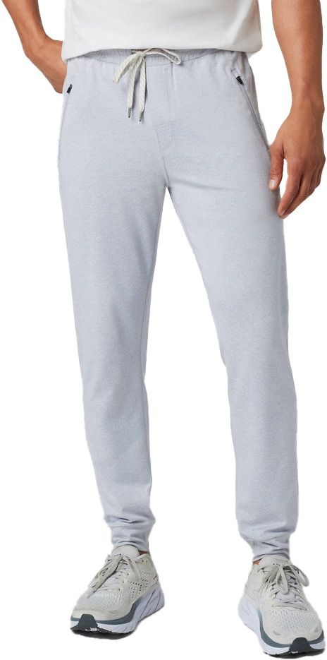 Ponto Performance Jogger 28″ Platinum Heather de Vuori : pantalon de running homme en DreamKnit™ recyclé ultra-doux, évacue l’humidité, coupe ajustée et chevilles resserrées, taille élastique, poches zippées.
