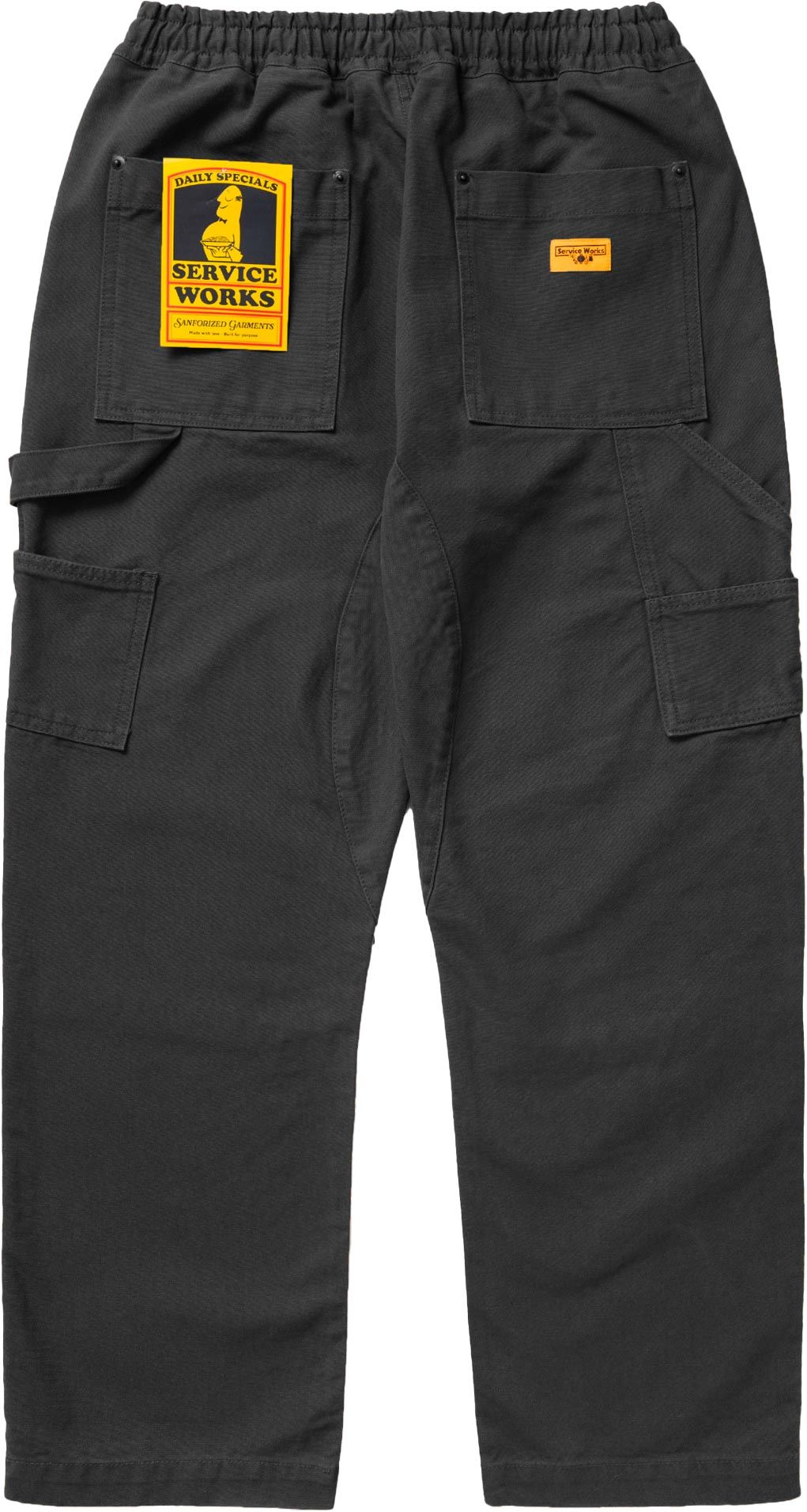 Service Works Utility Chef Pants Black : pantalon de cuisine en coton biologique GOTS, ceinture élastiquée réglable, entrejambe renforcé et poches cargo surélevées pour un confort durable.
