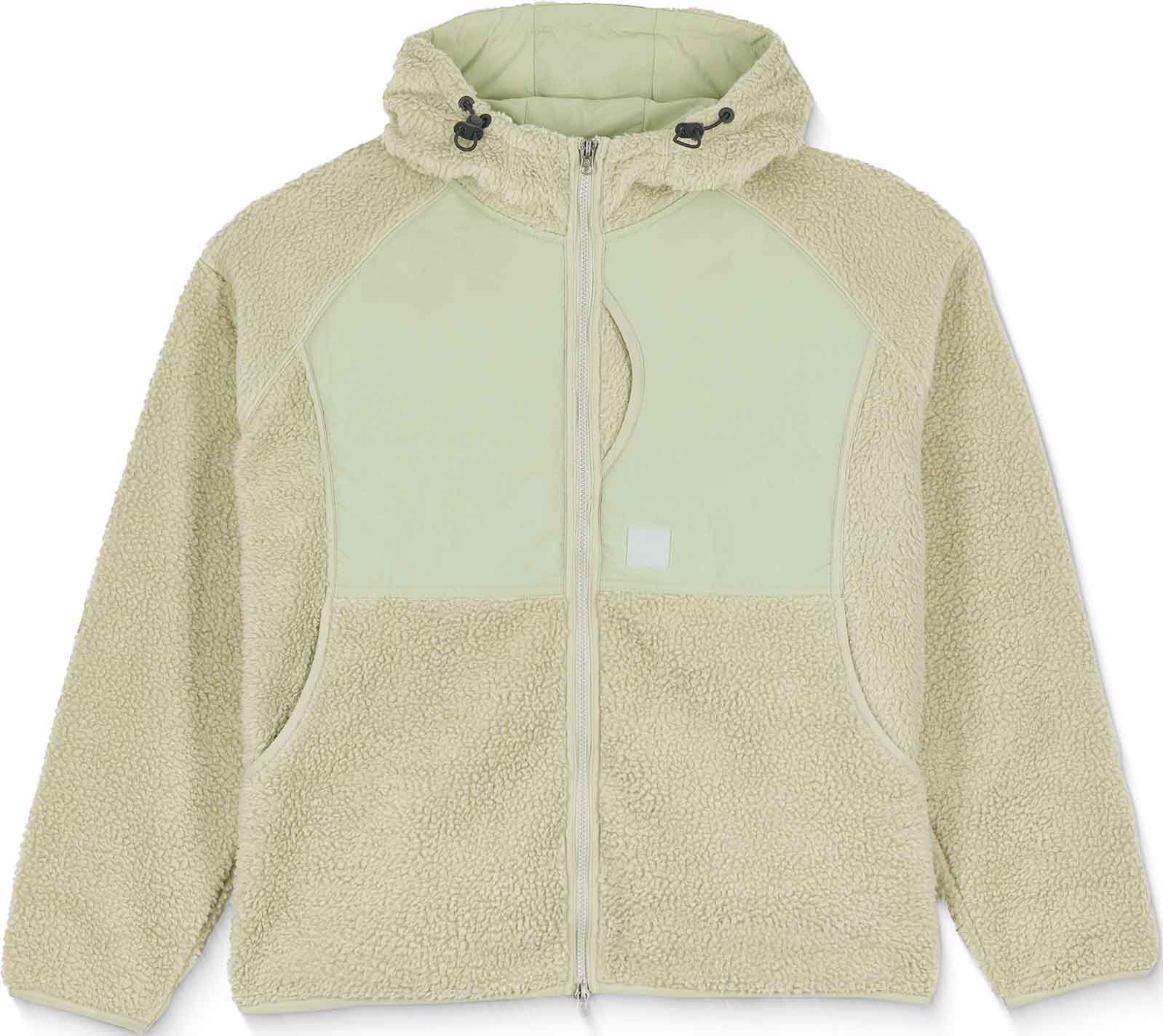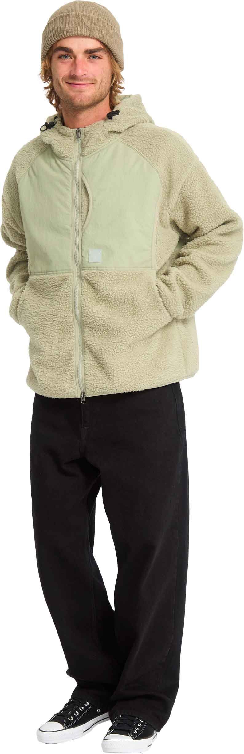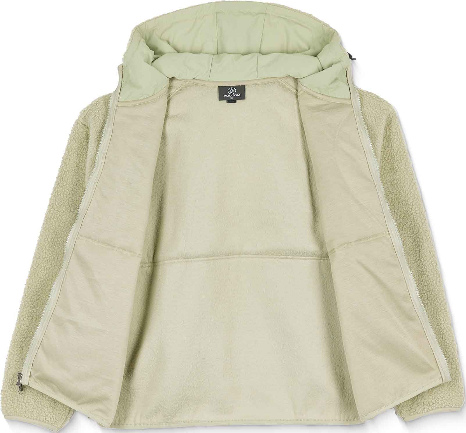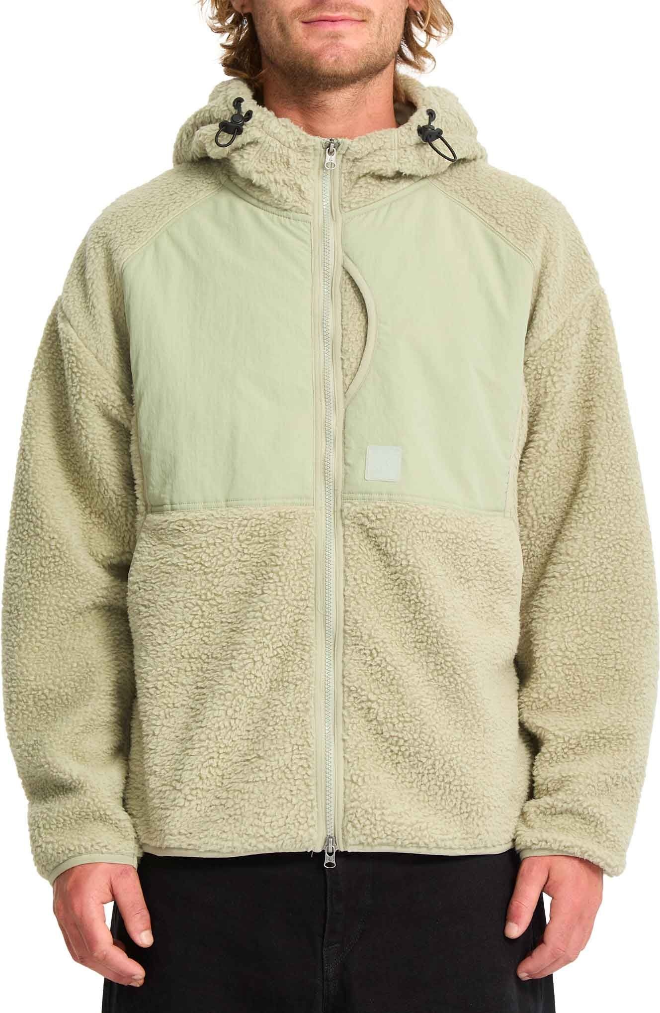Sweat à capuche zippé Volcom Nomaa Sherpa Zip Green Tea homme en sherpa polyester dense, isolation optimale, coupe ajustée, poches chauffe-mains et poitrine, finitions élastiques, panneaux ripstop.