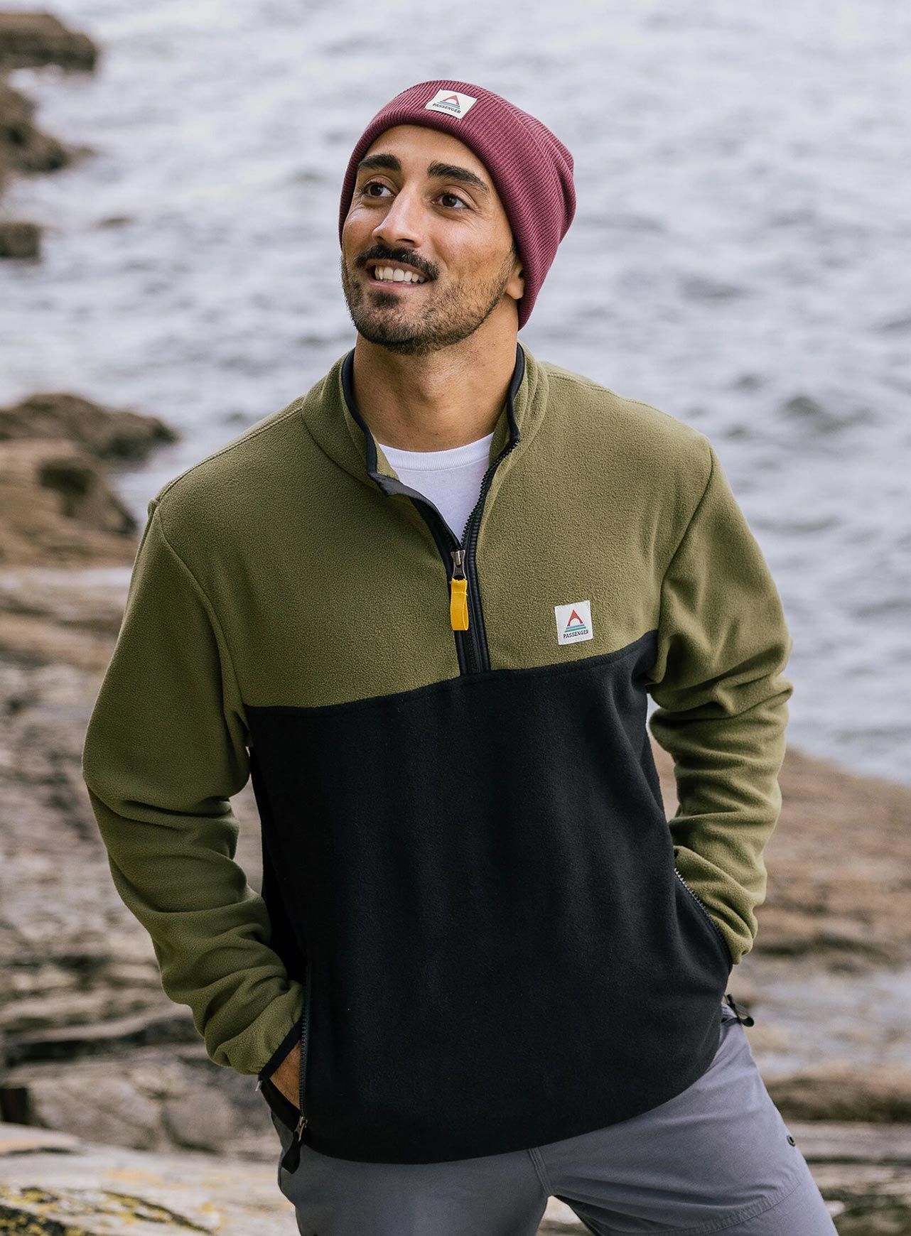La polaire Passenger Clothing Set Off Recycled Polar 1/4 Zip Fleece Khaki pour homme, en polyester recyclé, offre isolation thermique, douceur moelleuse, poches zippées et col montant pour les sorties outdoor et la vie nomade.