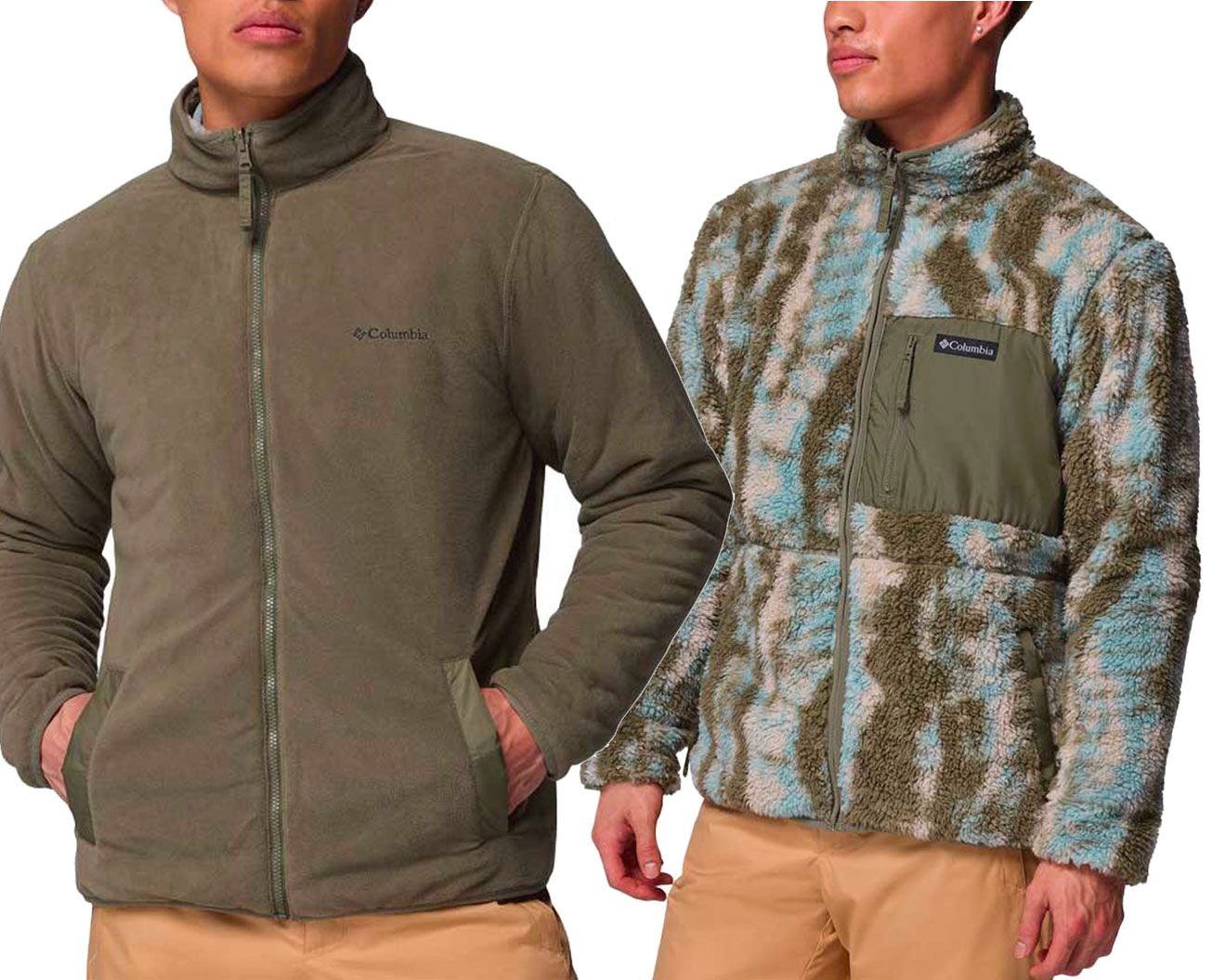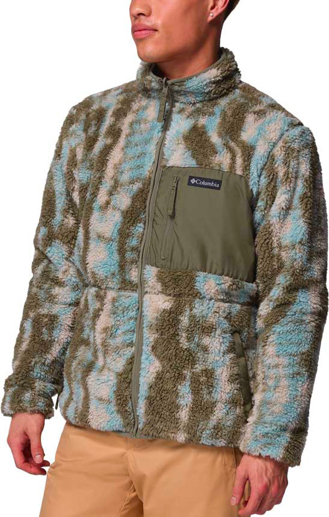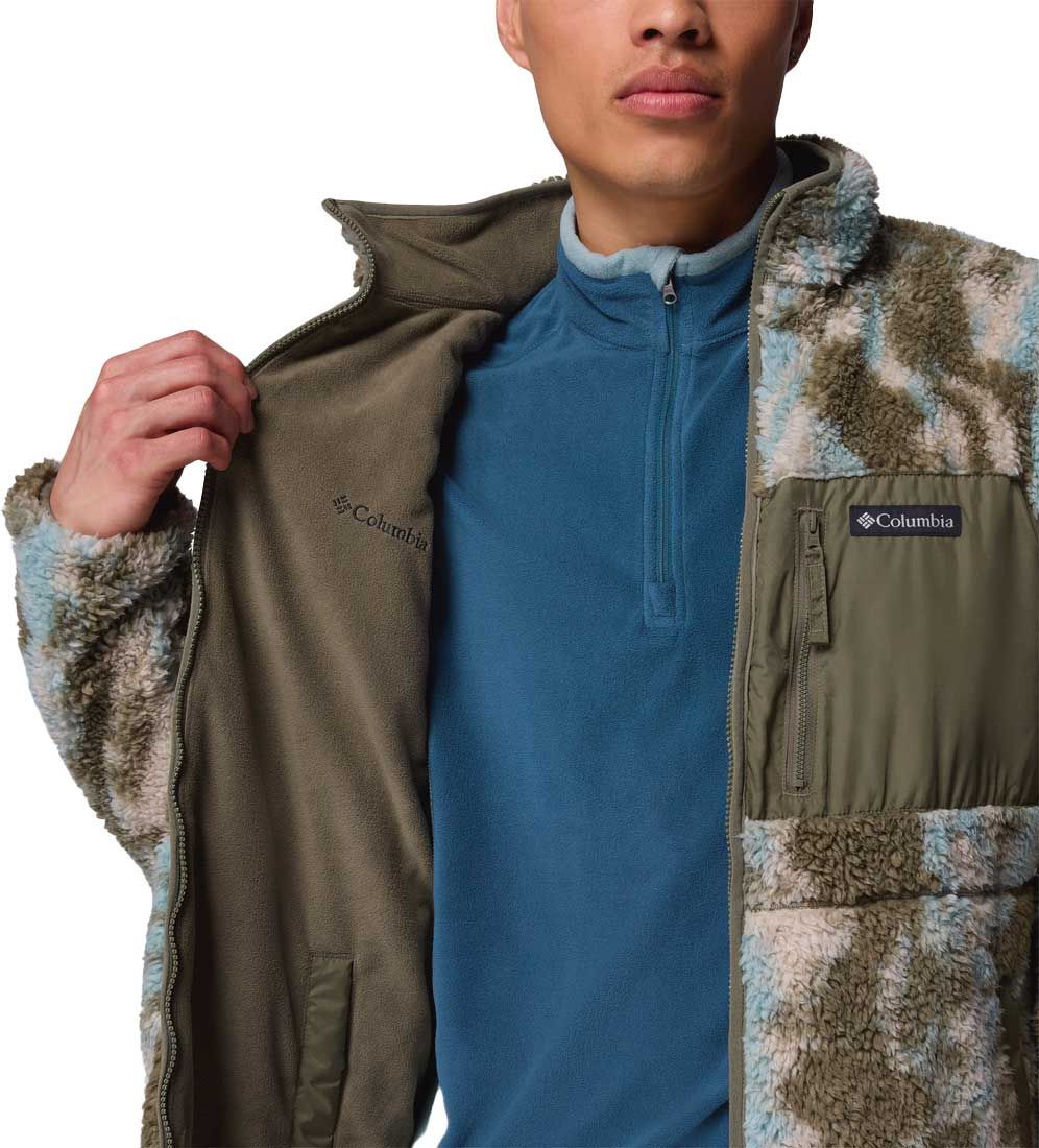 Columbia Winter Pass Reversible Fleece Stone Green Tracks, polaire réversible homme : face sherpa chaude et face micropolaire technique, 2 poches poitrine zippées et poches mains pour une protection adaptable en ville ou en rando.