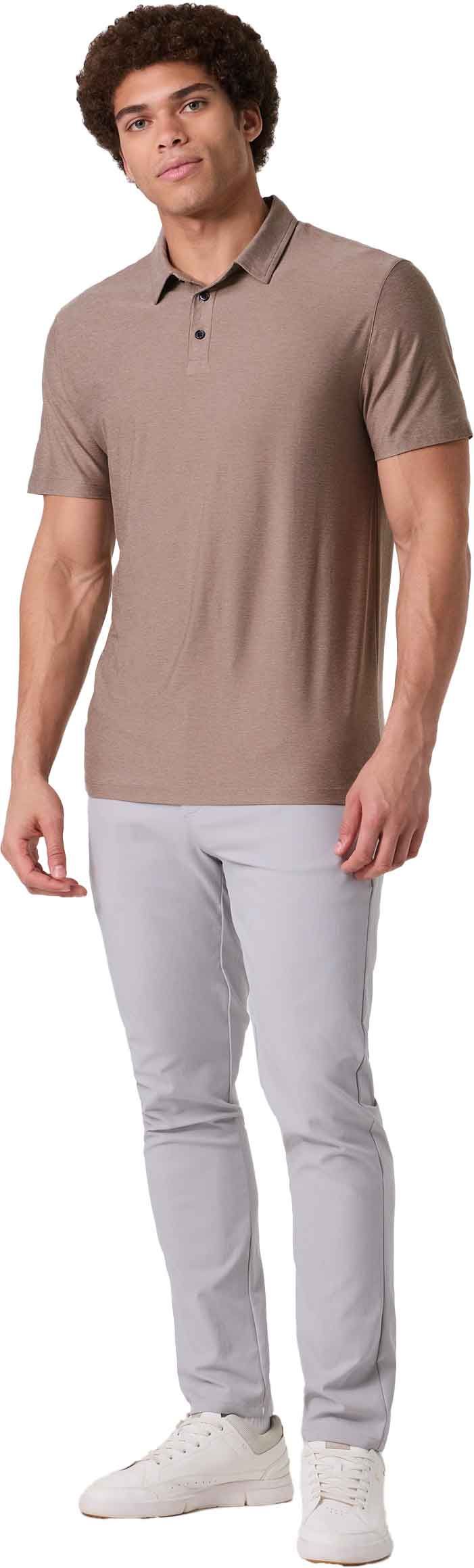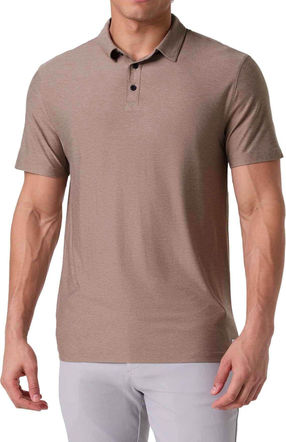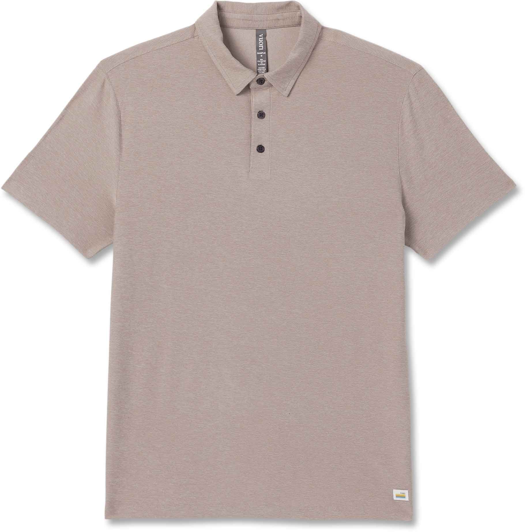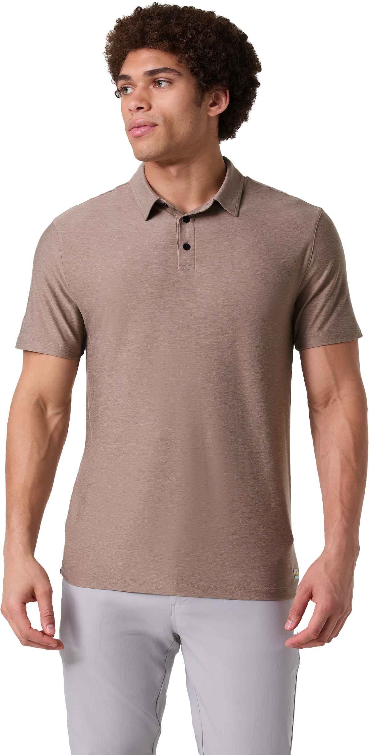 Le polo technique Vuori Strato Tech Polo Mocha Heather pour homme combine coton ultra-doux et tissu extensible quadridirectionnel léger pour liberté de mouvement et évacuation de l’humidité lors du yoga, de l’entraînement ou de la course.