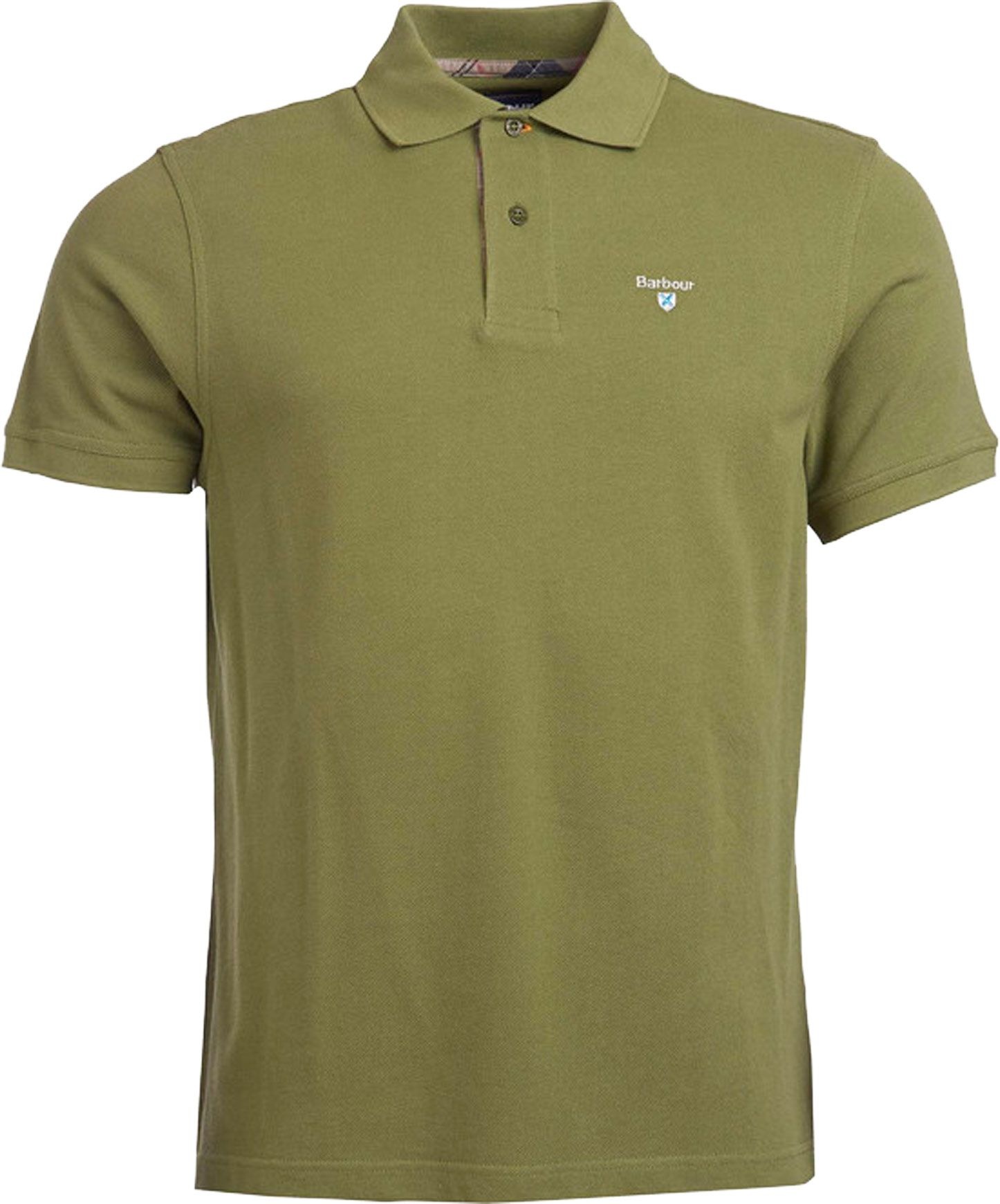 Polo Barbour Tartan Pique Polo Shirt Burnt Olive homme en piqué de coton respirant, col et patte intérieure en tartan écossais, coupe classique intemporelle.