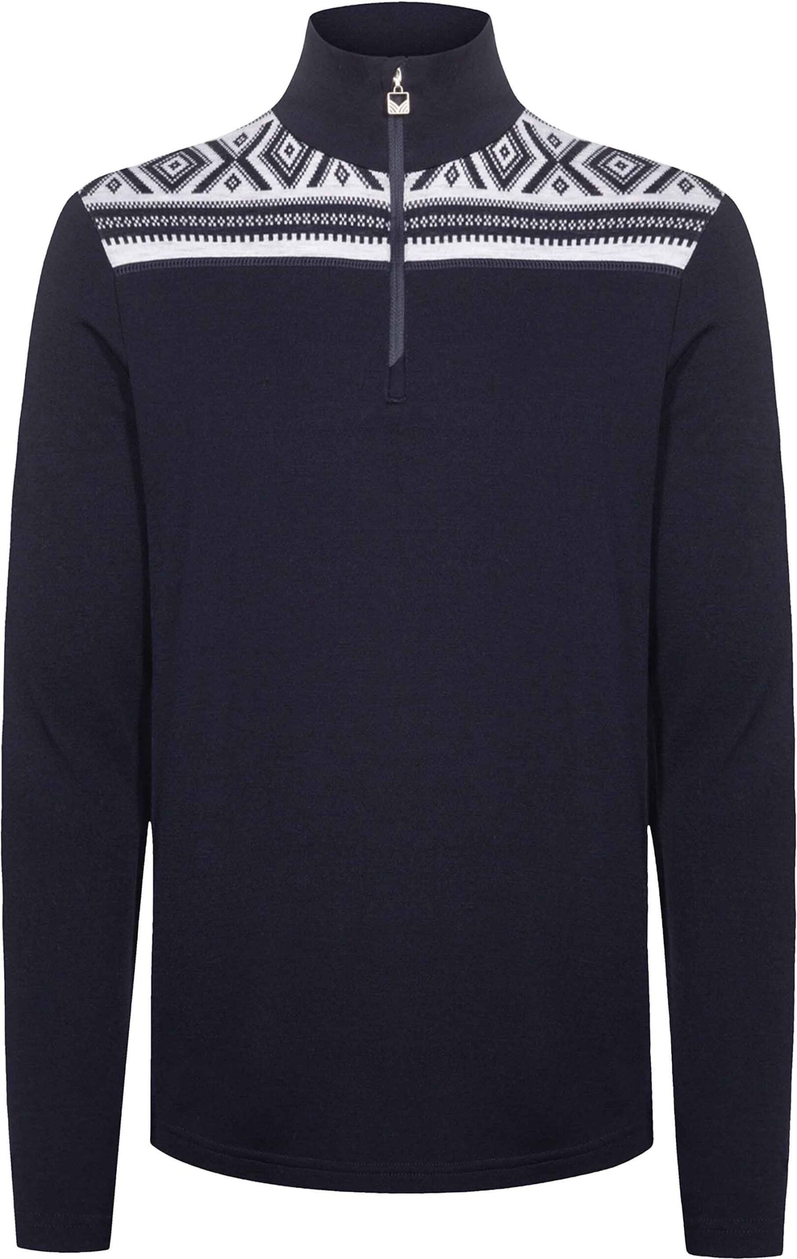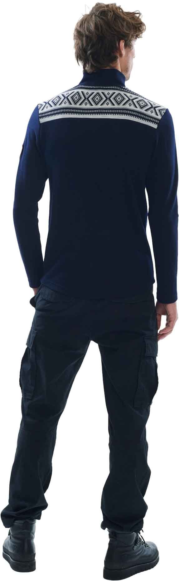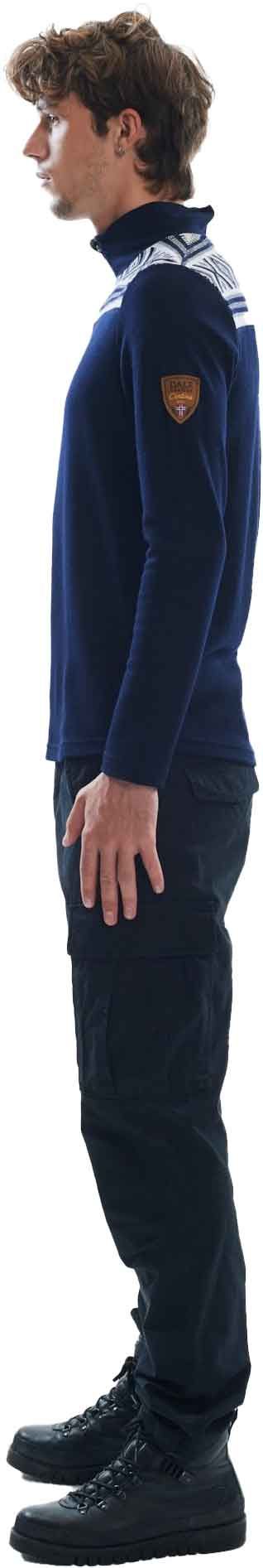 Dale of Norway Cortina Basic Sweater Navy/Off White, pull homme 100% laine mérinos, offre isolation thermique, respirabilité et neutralisation des odeurs. Col montant, demi-zip et motifs graphiques pour un style sportif chic.