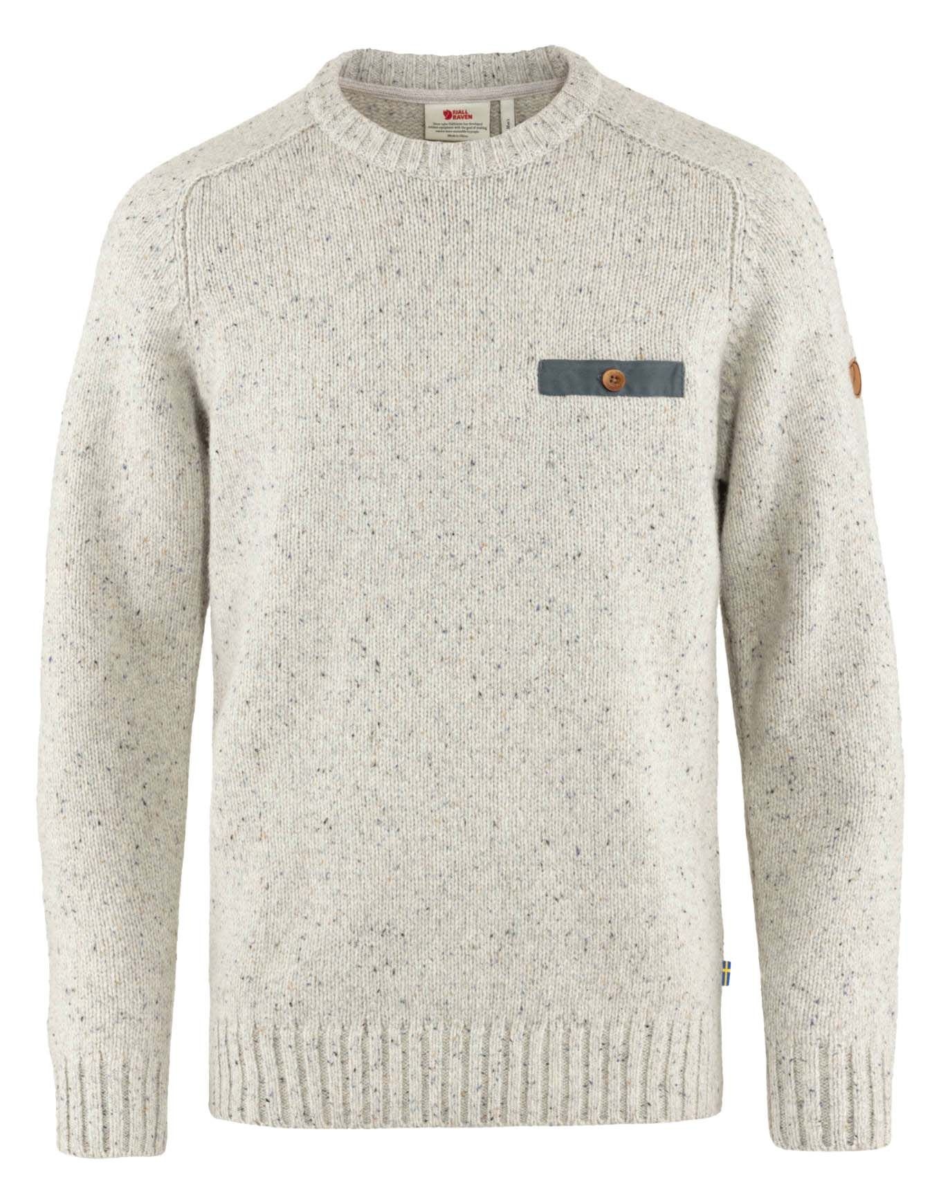 Pull en laine Lada Roundneck Chalk White Fjällräven pour homme, chaud à grosse maille, évacue l’humidité et garde la chaleur même mouillé.