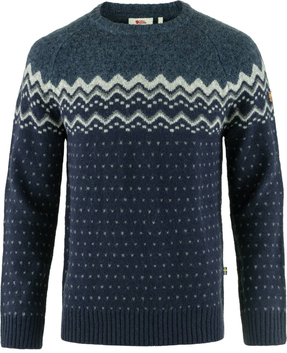 Pull Fjällräven Övik Knit homme en laine jacquard marine, isolant et respirant, porté seul ou en couche intermédiaire pour l’hiver.