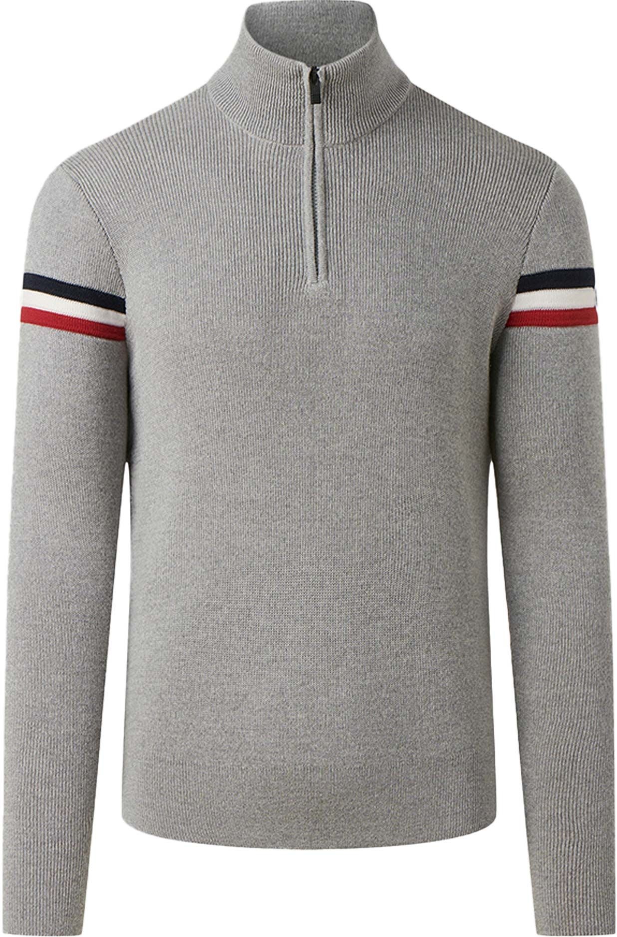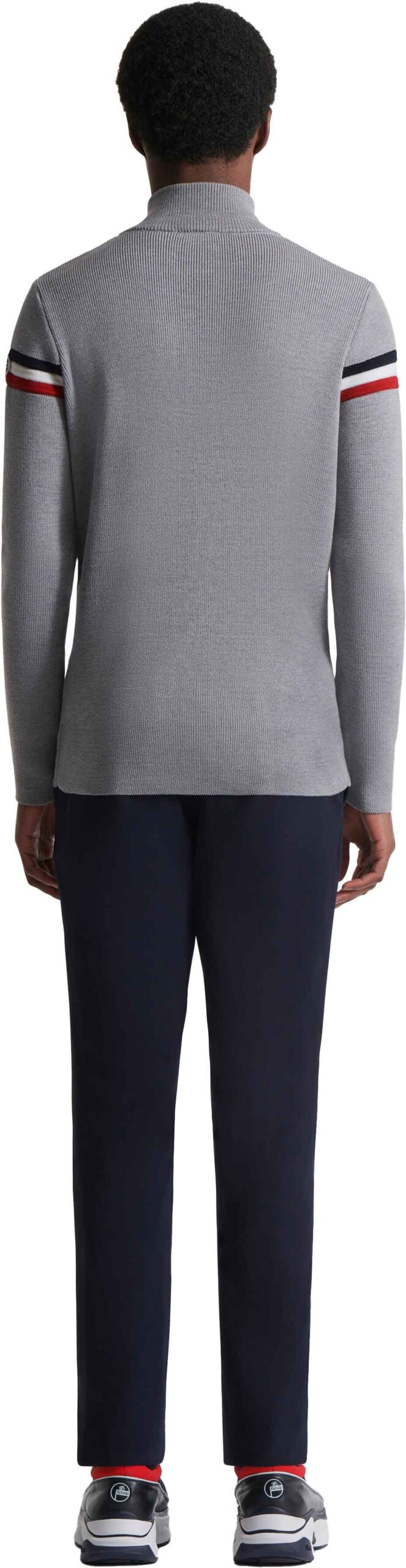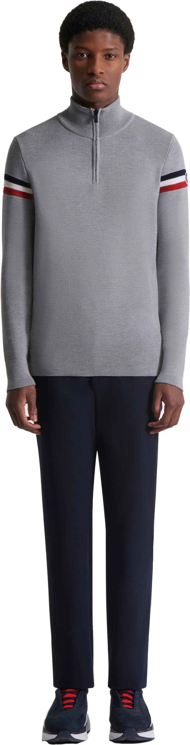 Pull zippé Fusalp Wengen IV Silice Marin pour homme en laine mérinos italienne, thermorégulant et respirant, col montant protecteur, finitions tricolores, style casual chic hivernal.