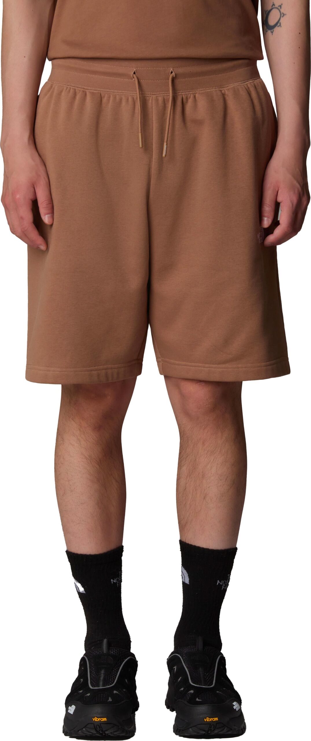 The North Face Essential Relaxed Short Latte est un short homme en coton brossé, confortable et décontracté pour le quotidien ou le yoga, avec taille ajustable et poches latérales.