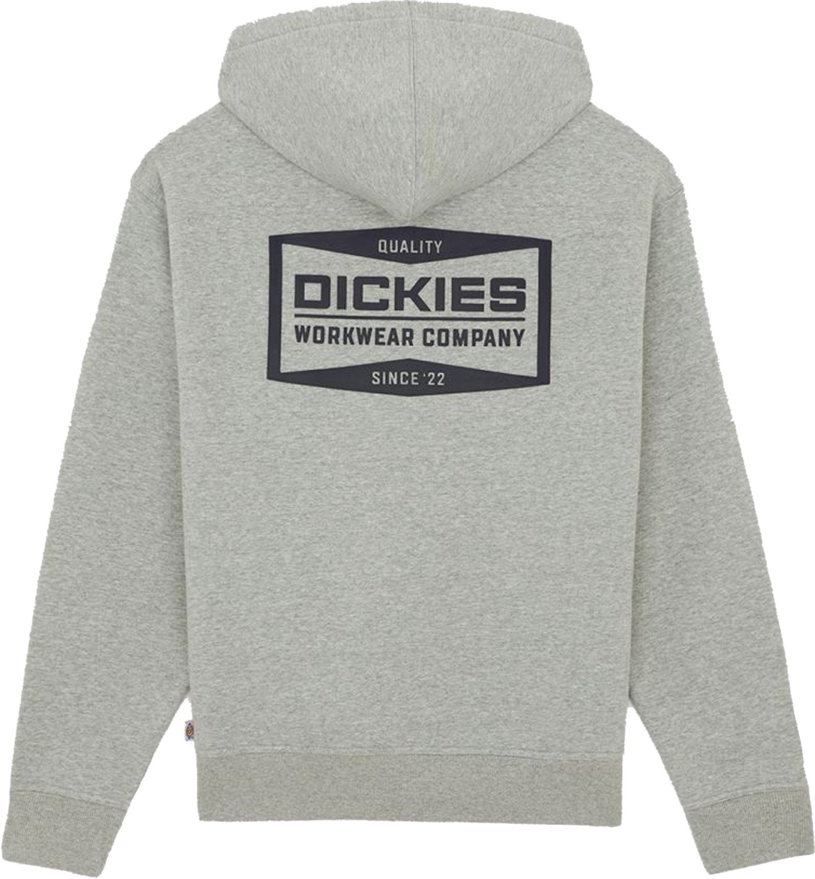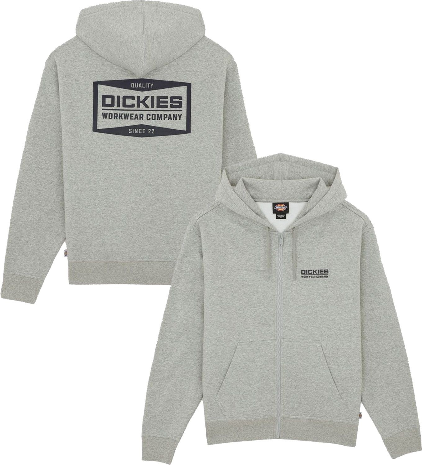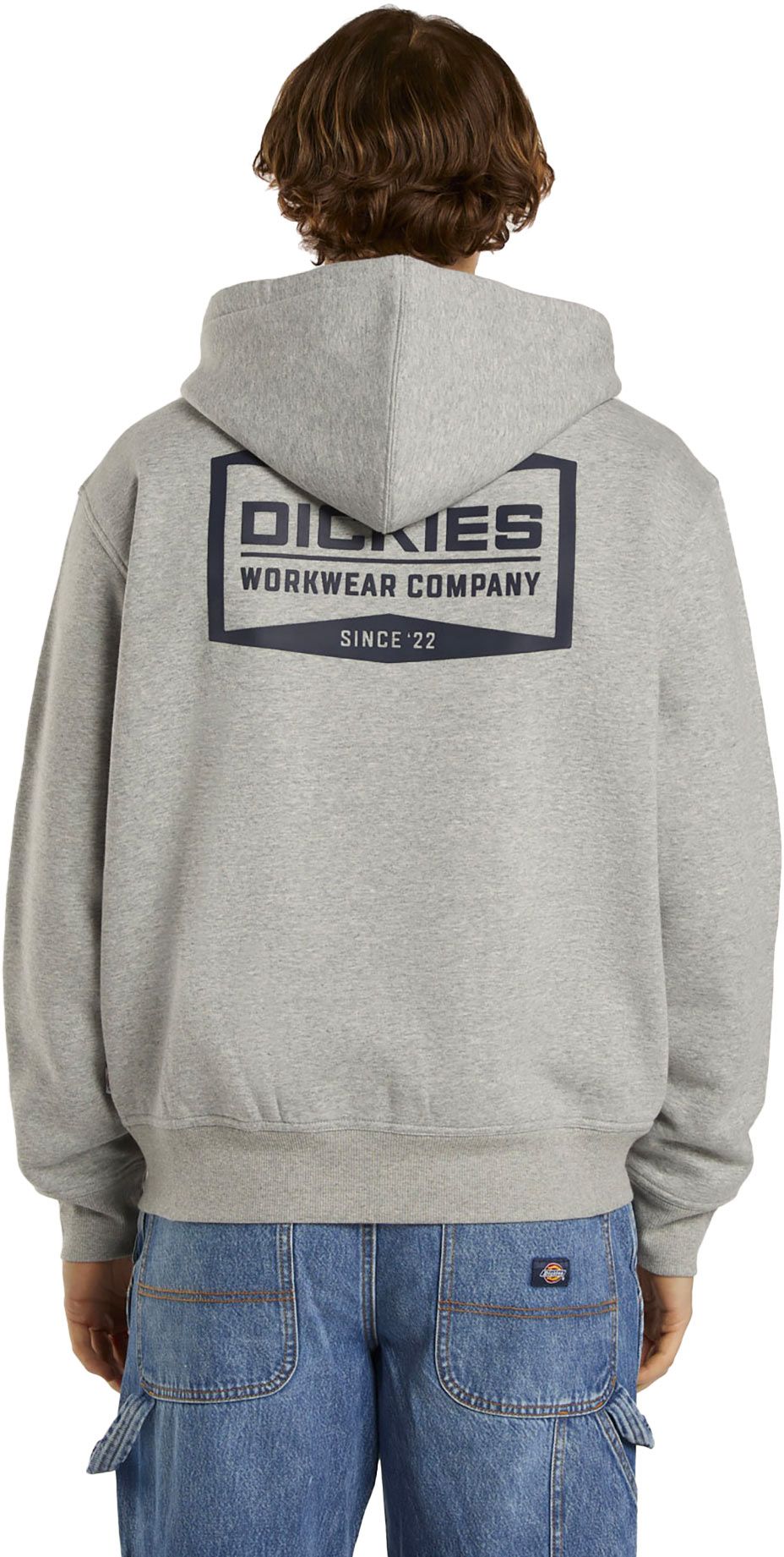 Dickies Bolivar Fz Hoodie Grey Melange : sweat à capuche homme en molleton brossé, coupe classique, finitions côtelées et imprimé vintage au dos pour un confort hivernal décontracté.