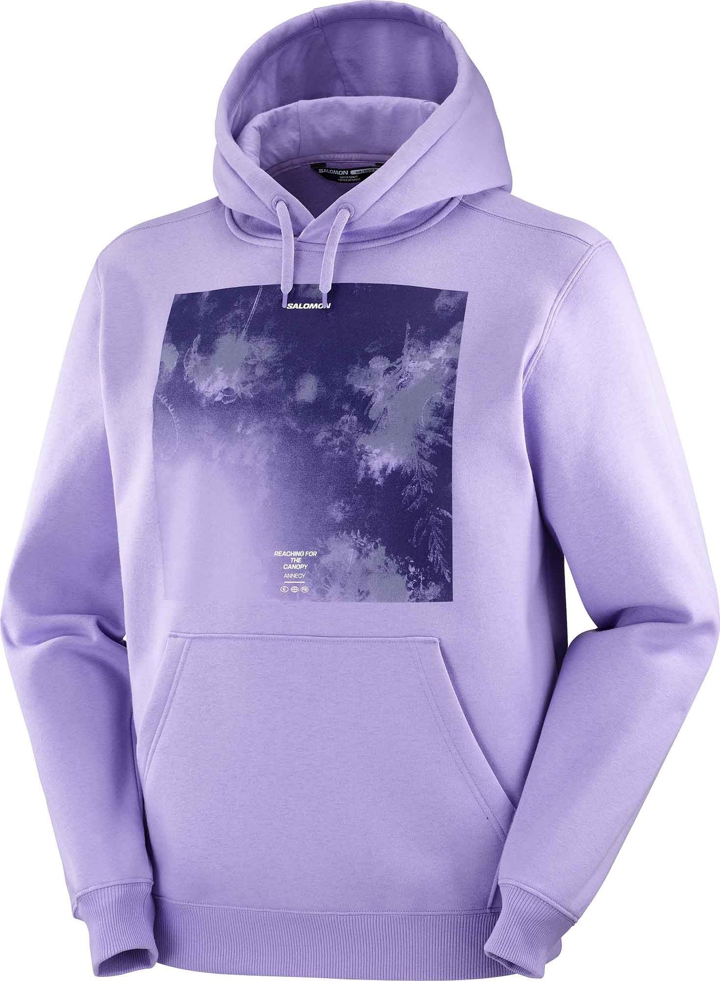 Sweat Salomon Canopy Hoodie Blue Granite femme en coton biologique 100 %, coupe standard douce et confortable. Motifs feuilles-nuages épurés, style sportswear citadin ou outdoor.