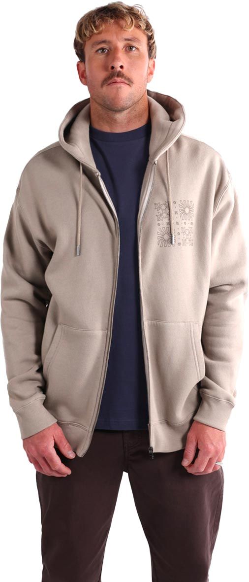 Sweat zippé à capuche Oxbow Sunrays Eternal Fleece Fullzip Hood Rock homme, molleton brossé épais, capuche ajustable et poche kangourou, grande sérigraphie dos, finitions côtes poignets et taille.