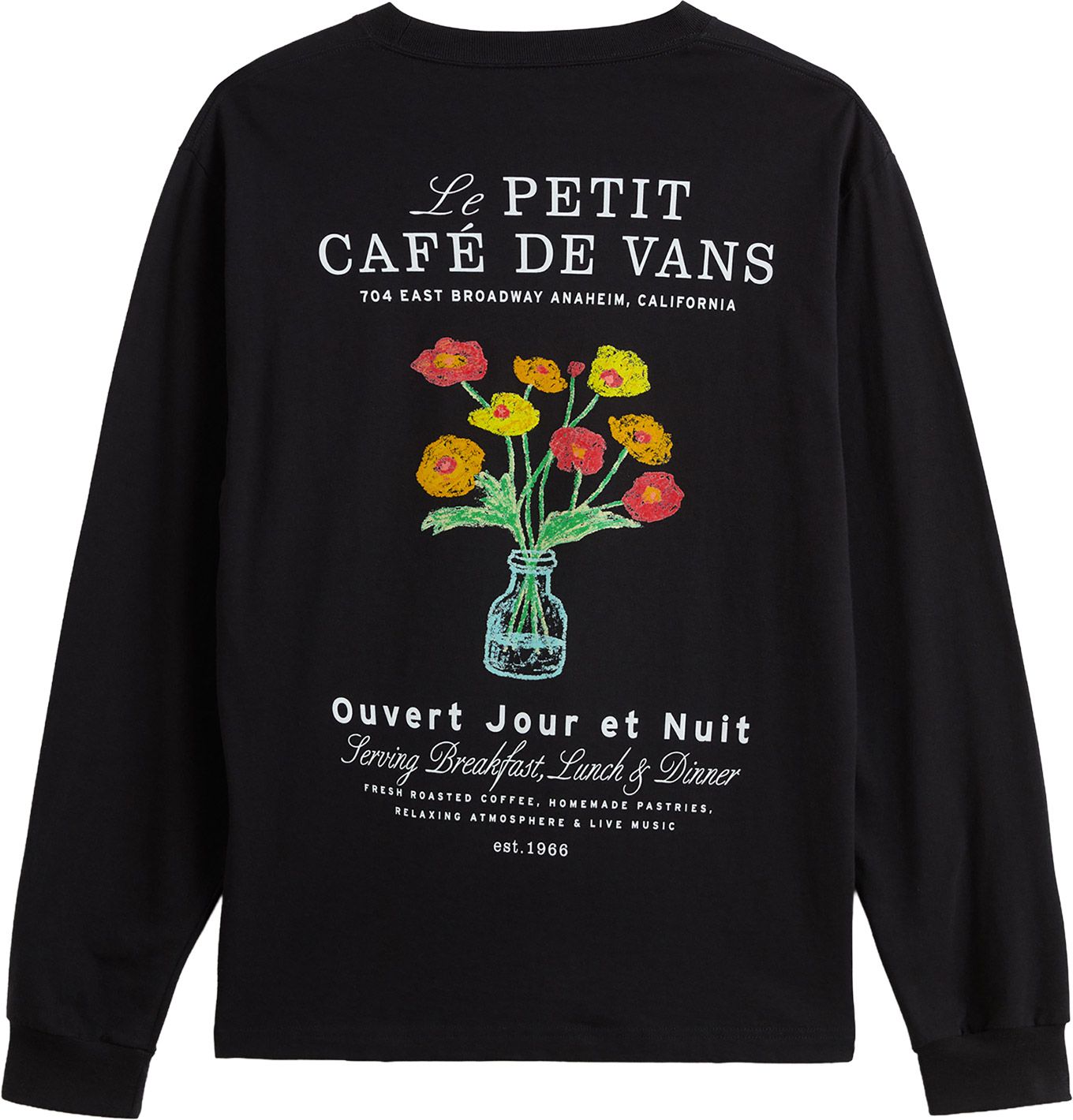 T-shirt Vans Cafe Vans LS Black pour homme en 100 % coton, coupe classique col rond. Confortable et doux, il s’adapte à tous les styles, du décontracté au sophistiqué.