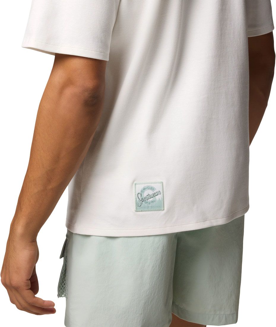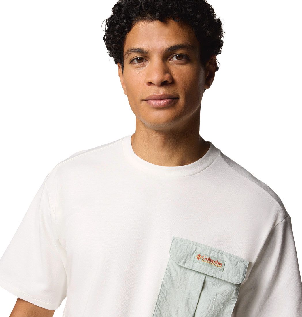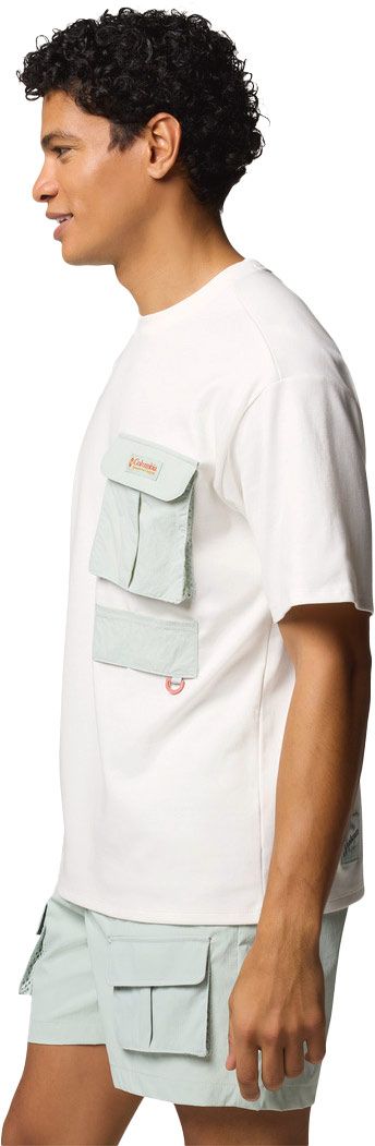 T-shirt Columbia Cove Beach Pocket Tee Sea Salt, Cool Green en coton avec panneaux nylon/mesh pour un séchage rapide, poche poitrine velcro, anneau D et protection solaire Omni-Shade UPF 50.