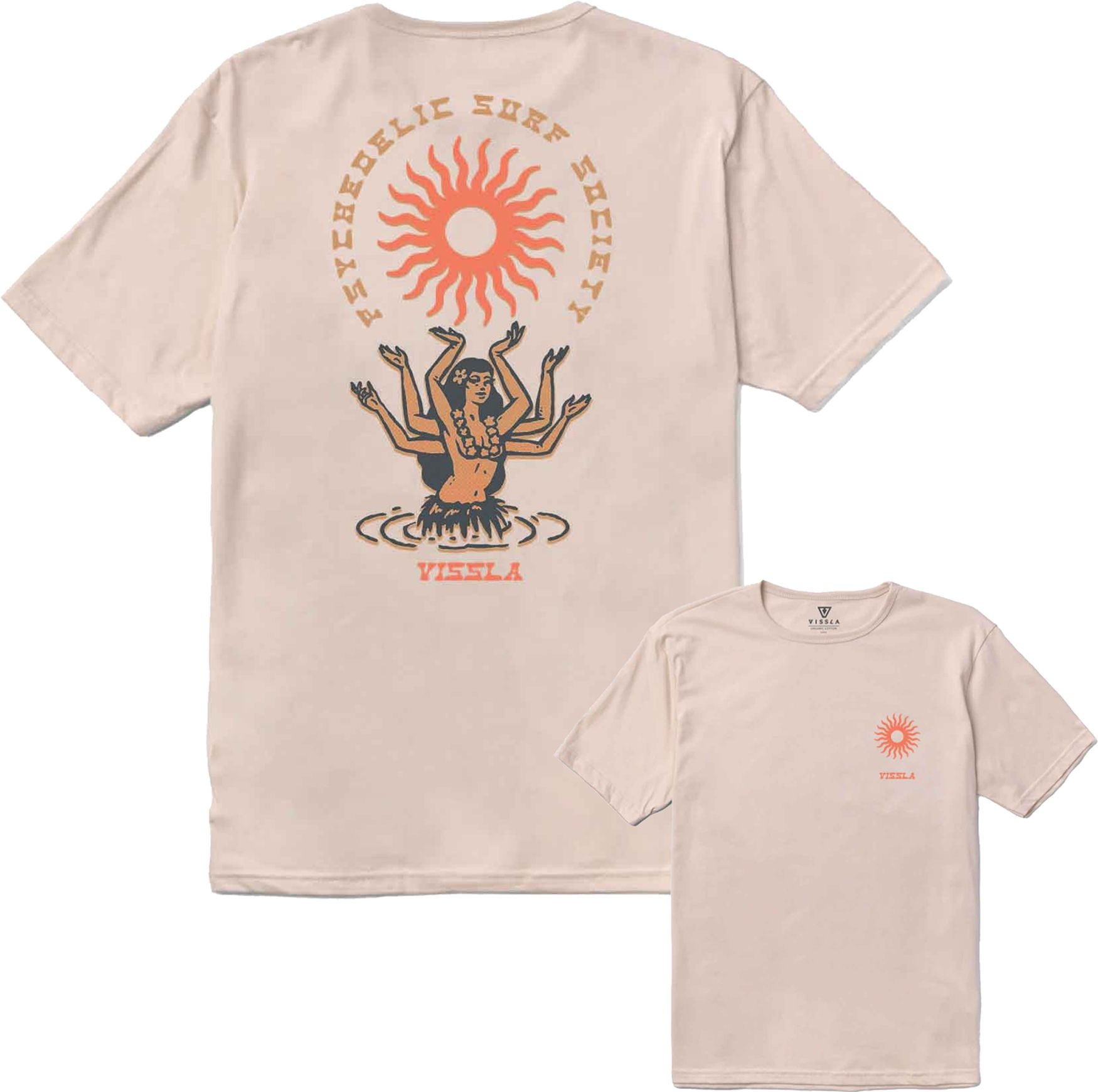 T-shirt Vissla Hula Hands Organic Tee Bone pour homme en coton biologique, coupe droite et col rond, motif vintage oversized au dos pour un look casual usé.