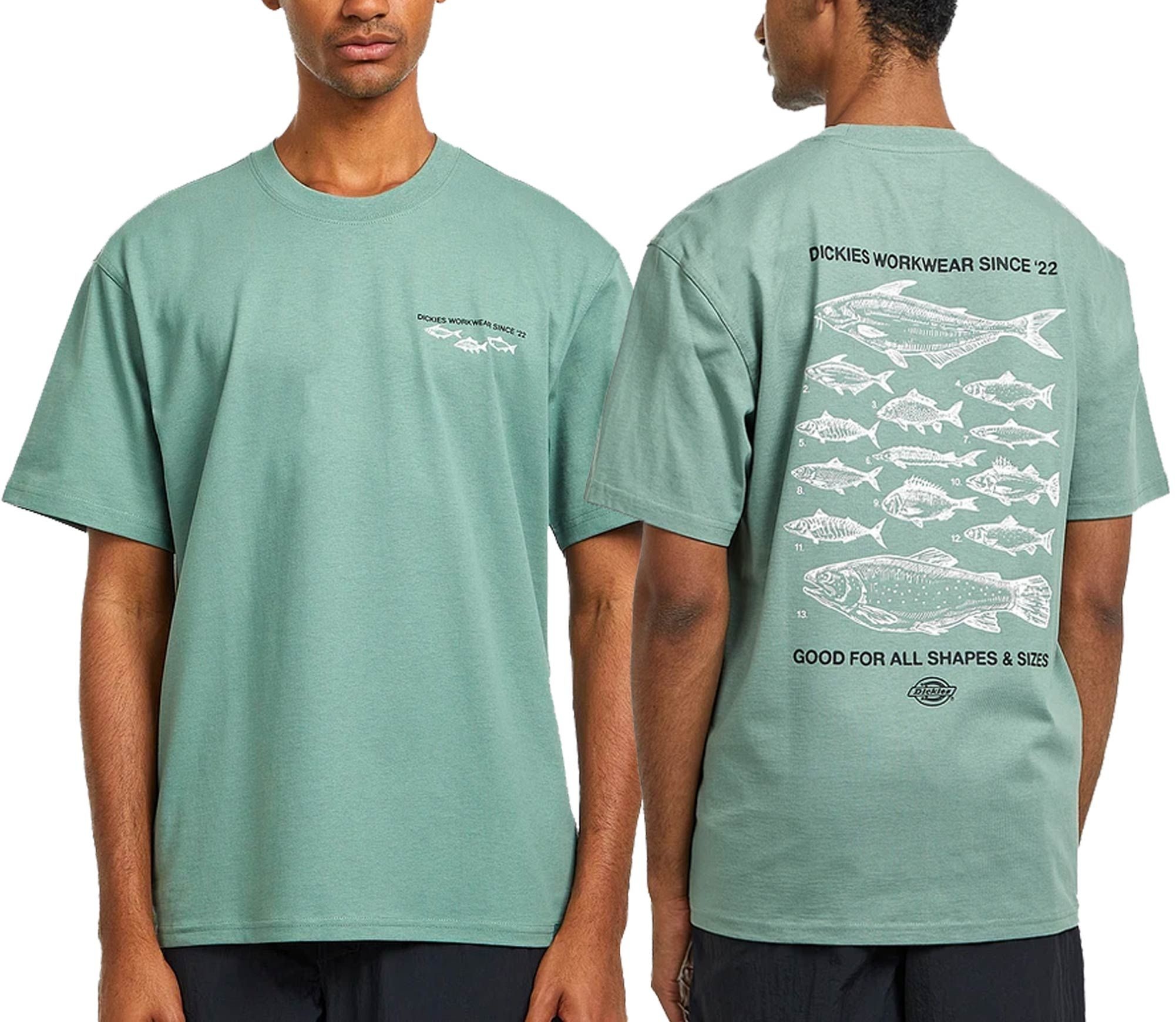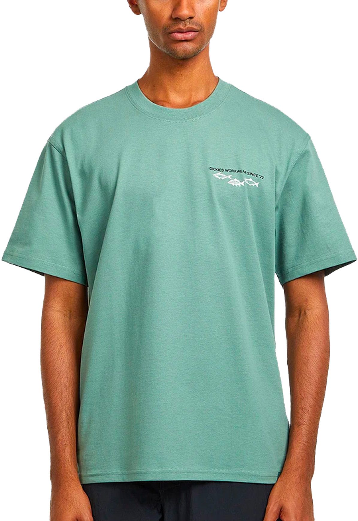 Dickies Laryville Tee SS Sea Spray, t-shirt homme à manches courtes en coton 100 %, col rond, arborant une grande sérigraphie vintage pêche au dos pour un style décontracté au quotidien.