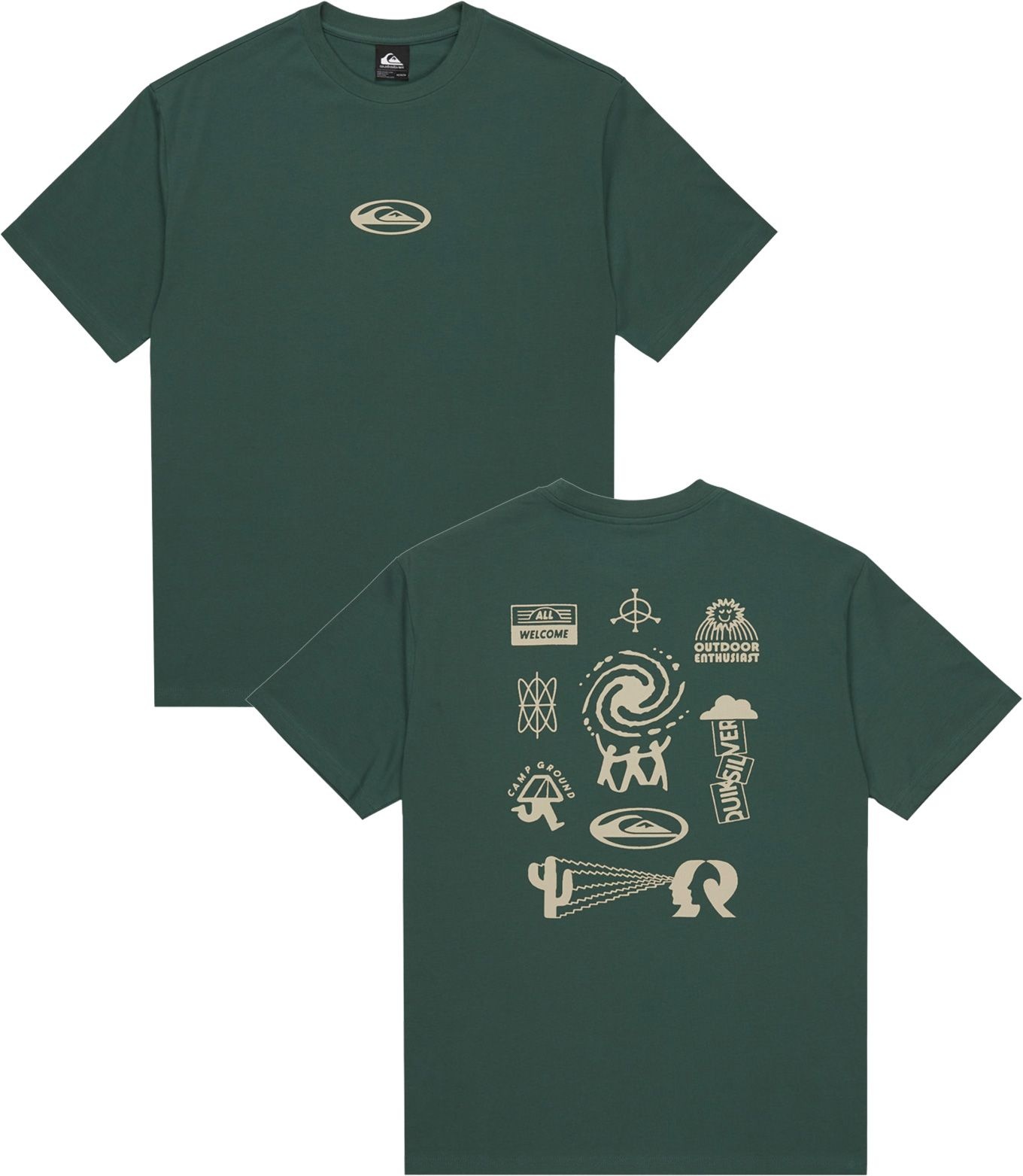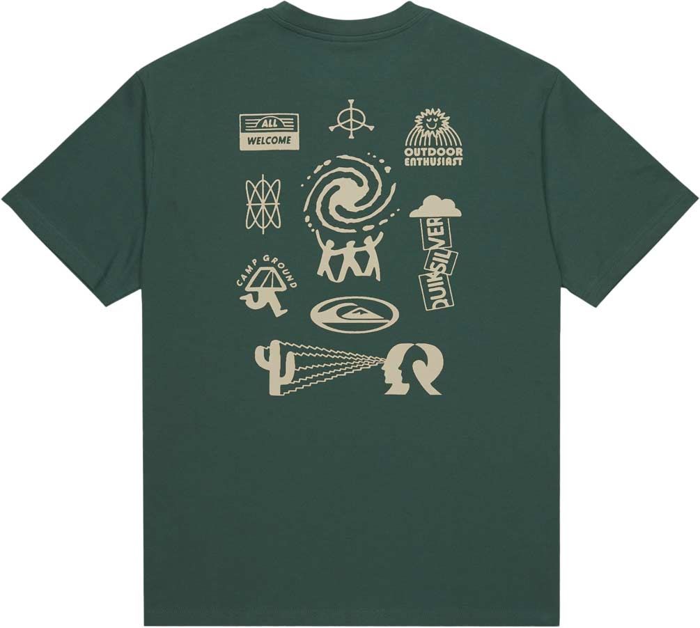 T-shirt Quiksilver Pto Welcome All SS Tee Trekking Green en 100 % coton bio pour homme, coupe ample, col rond et imprimés poitrine/dos.