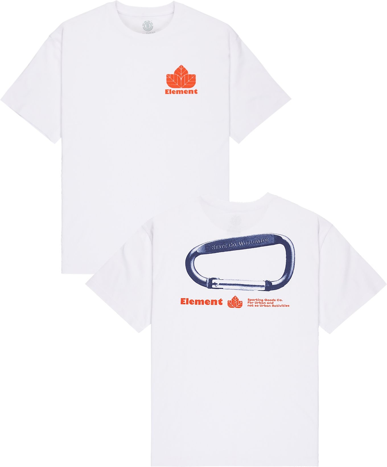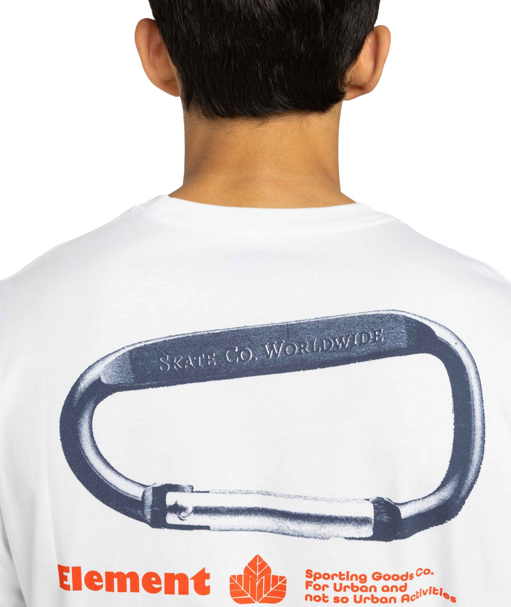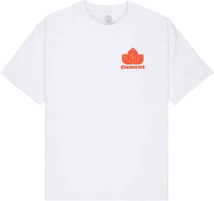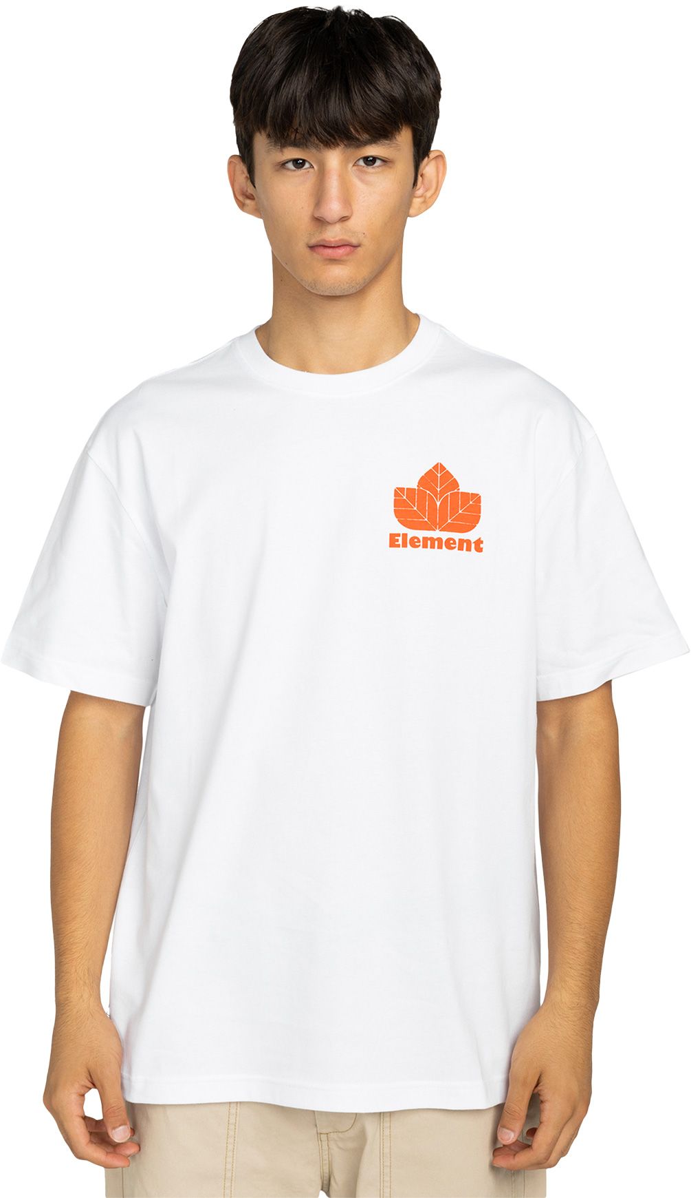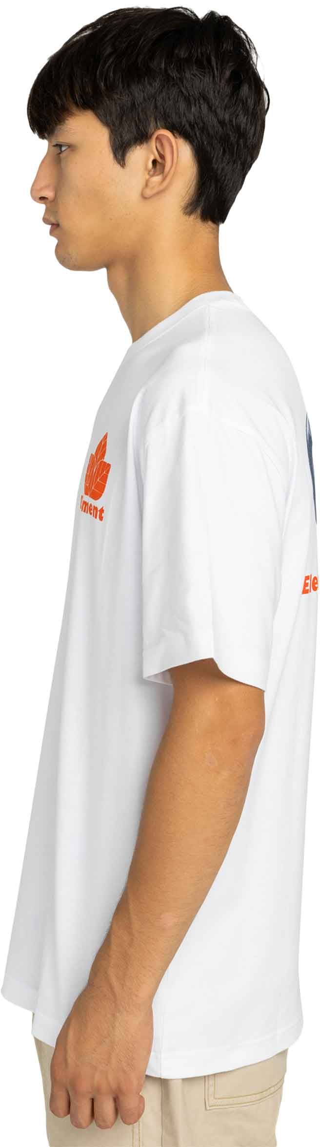 Tee-shirt à manches courtes Element Sporting SS Optic White pour homme, en coton biologique certifié, coupe ample avec imprimé poitrine et dos à l’encre à base d’eau, finition côtelée et coutures épaules renforcées.