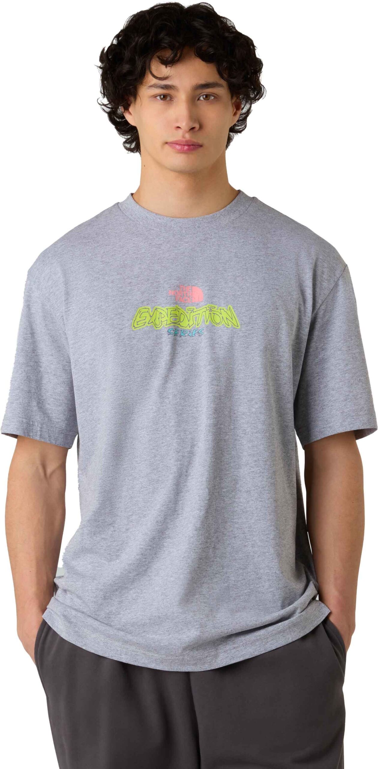 The North Face Expedition Celebration Oversized S/S Light Grey Heather est un t-shirt oversize homme en jersey 100 % coton, doux et respirant, offrant confort et liberté de mouvement. Ses imprimés à base d’eau avant/arrière allient style moderne et démarche responsable.