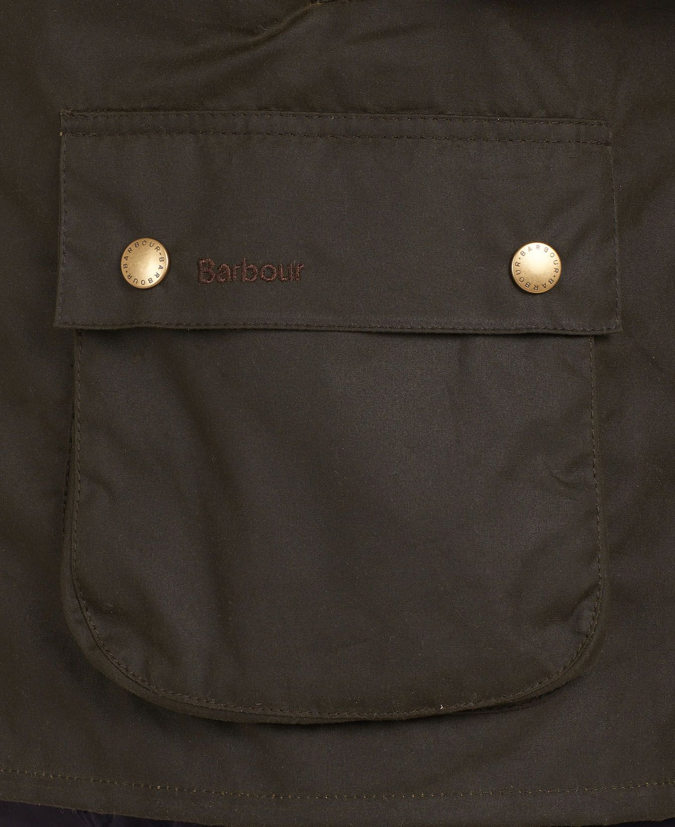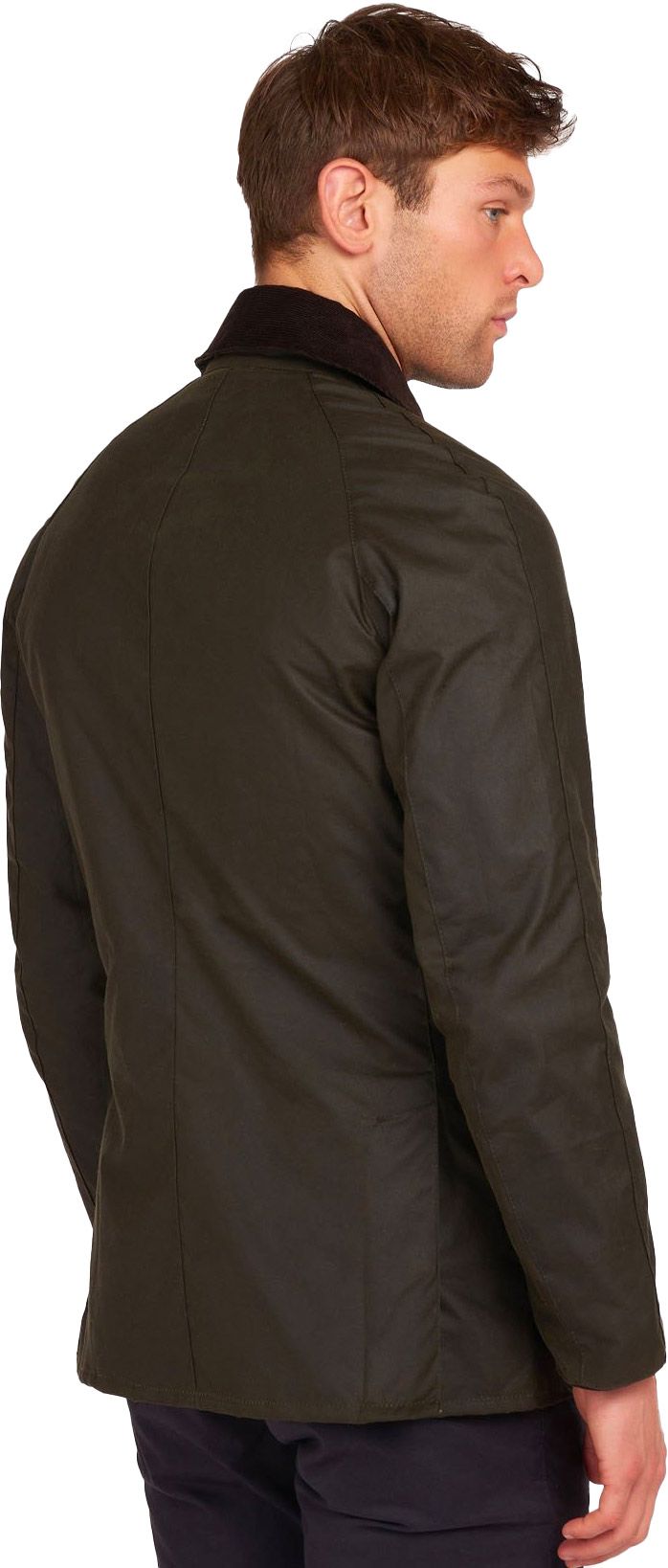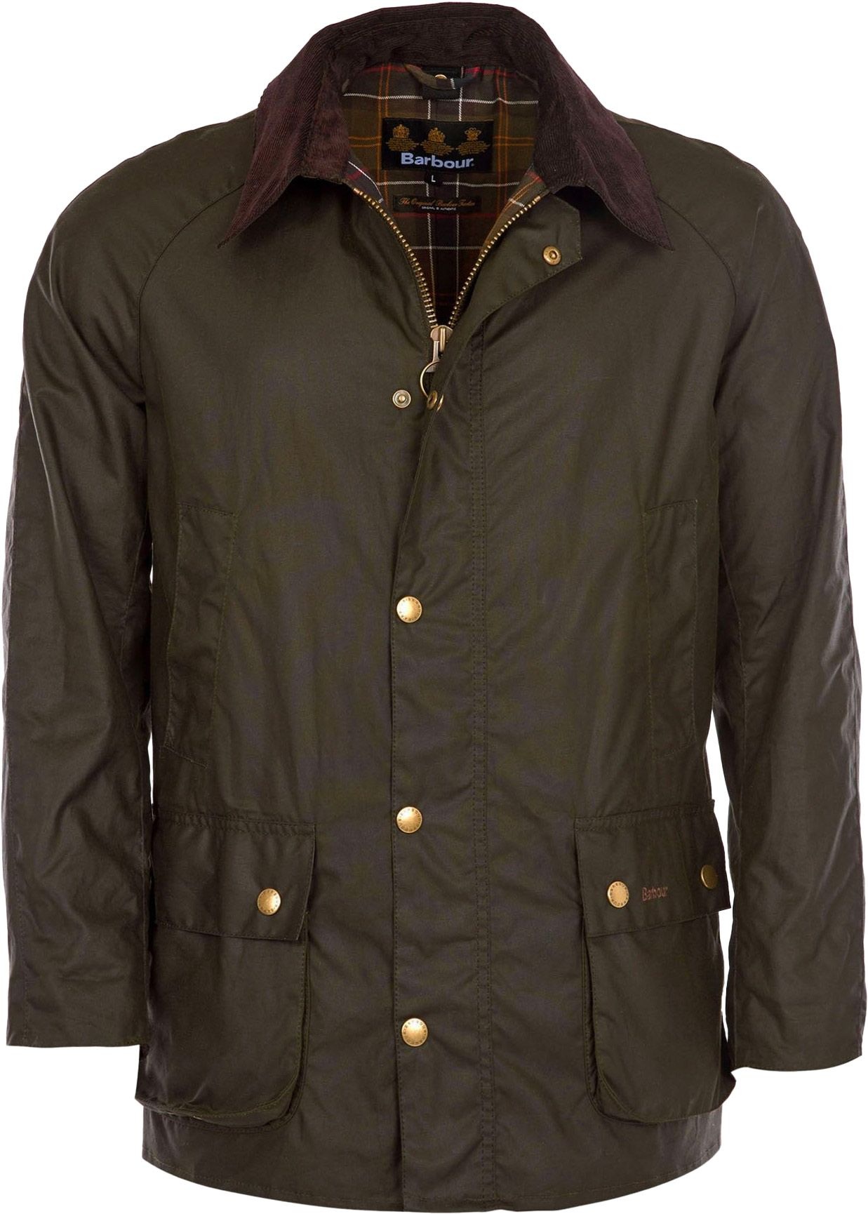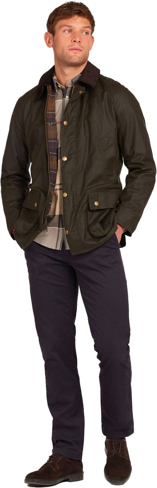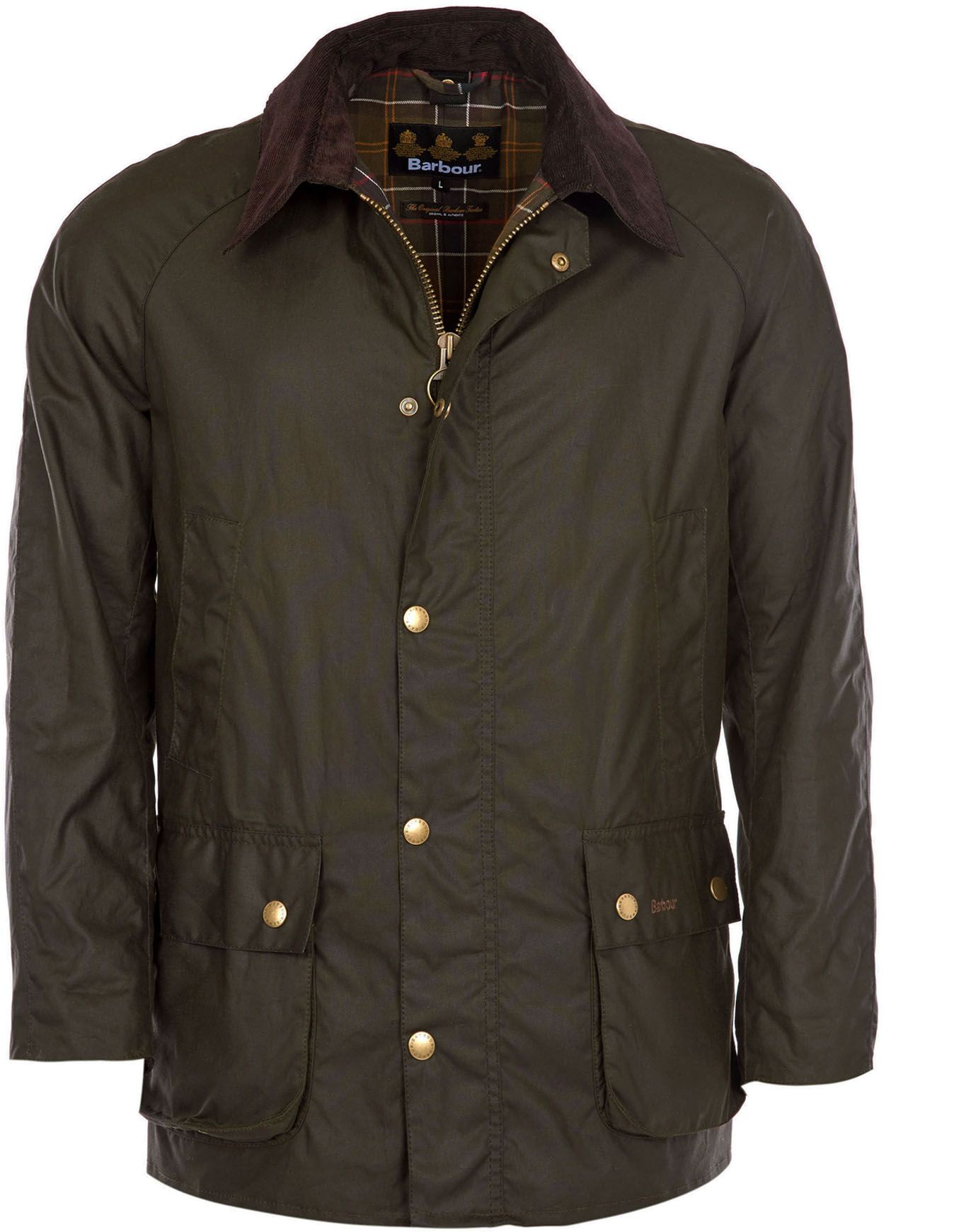 Veste Barbour Ashby Wax Jacket Olive pour homme, en coton ciré avec col velours côtelé, doublure tartan, poches fonctionnelles : style britannique intemporel, protection hivernale.