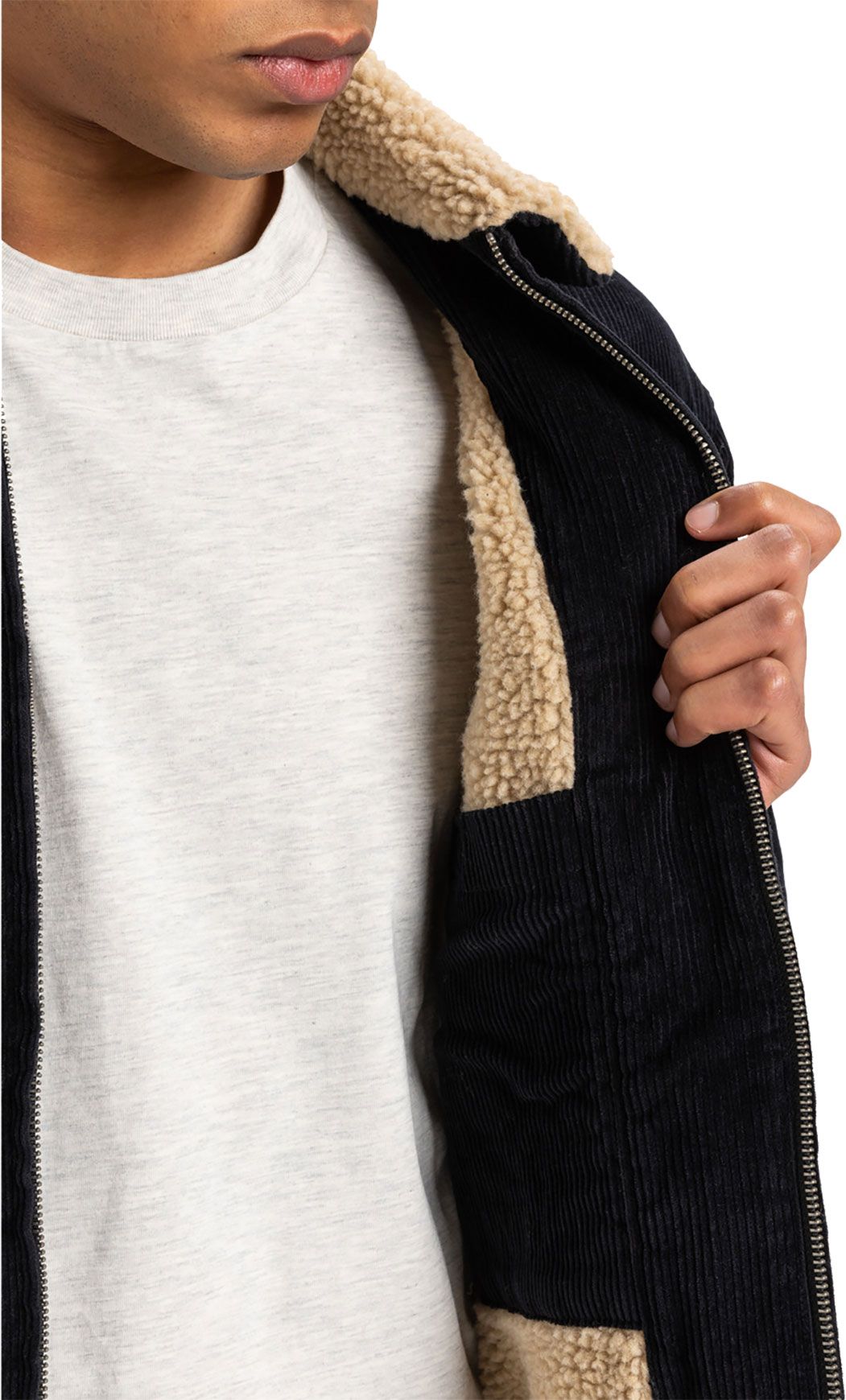 La veste Quiksilver DNA Sherpa Sponge/Grape Leaf en velours côtelé coton biologique est doublée polaire sherpa pour une chaleur hivernale, avec fermeture zippée intégrale, col classique, poche poitrine et poches chauffe-mains.