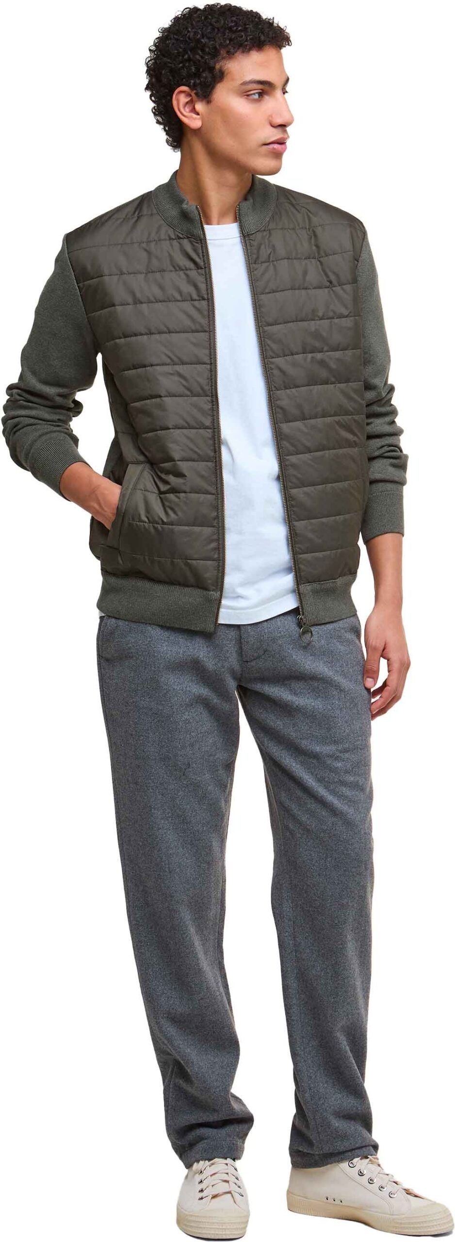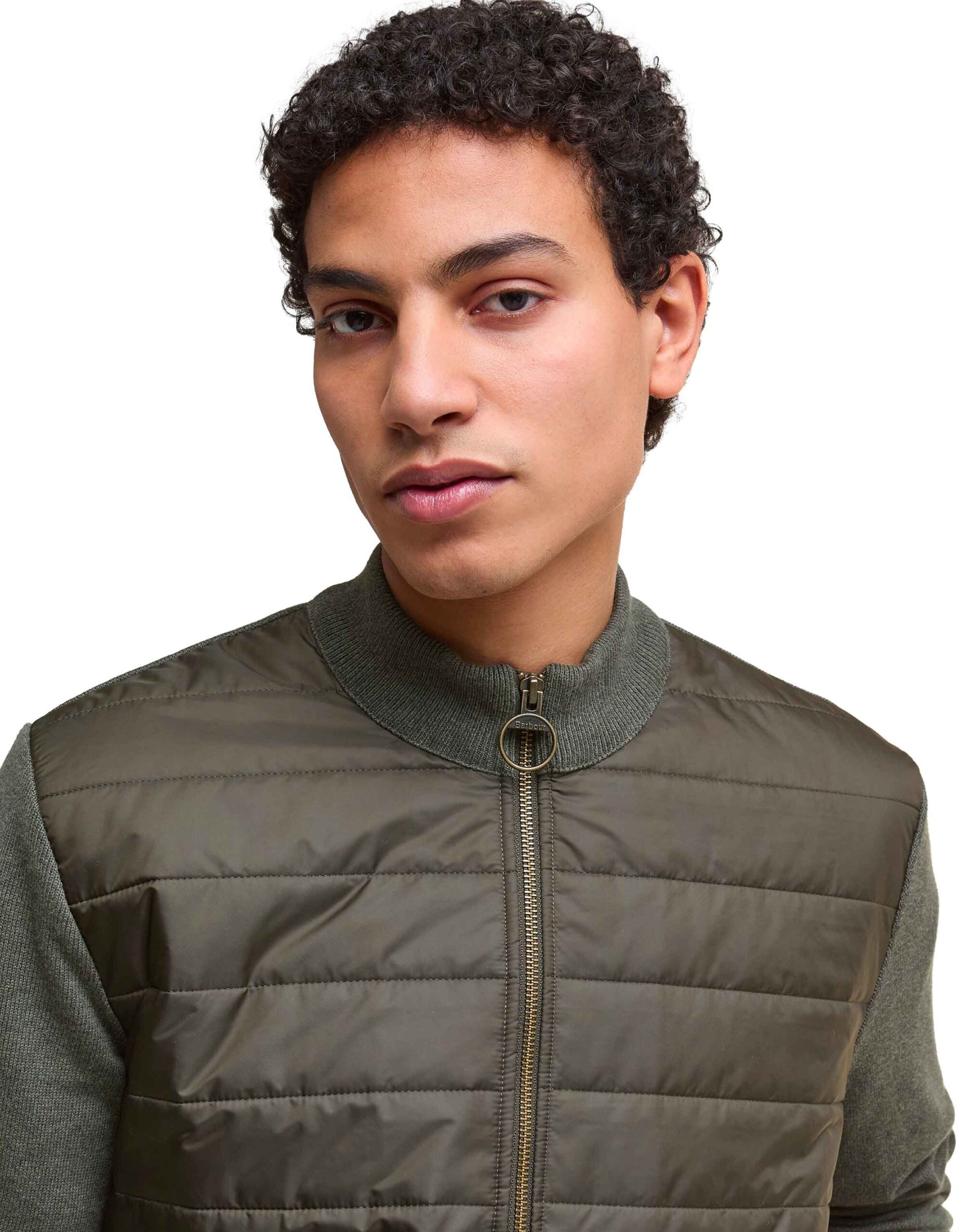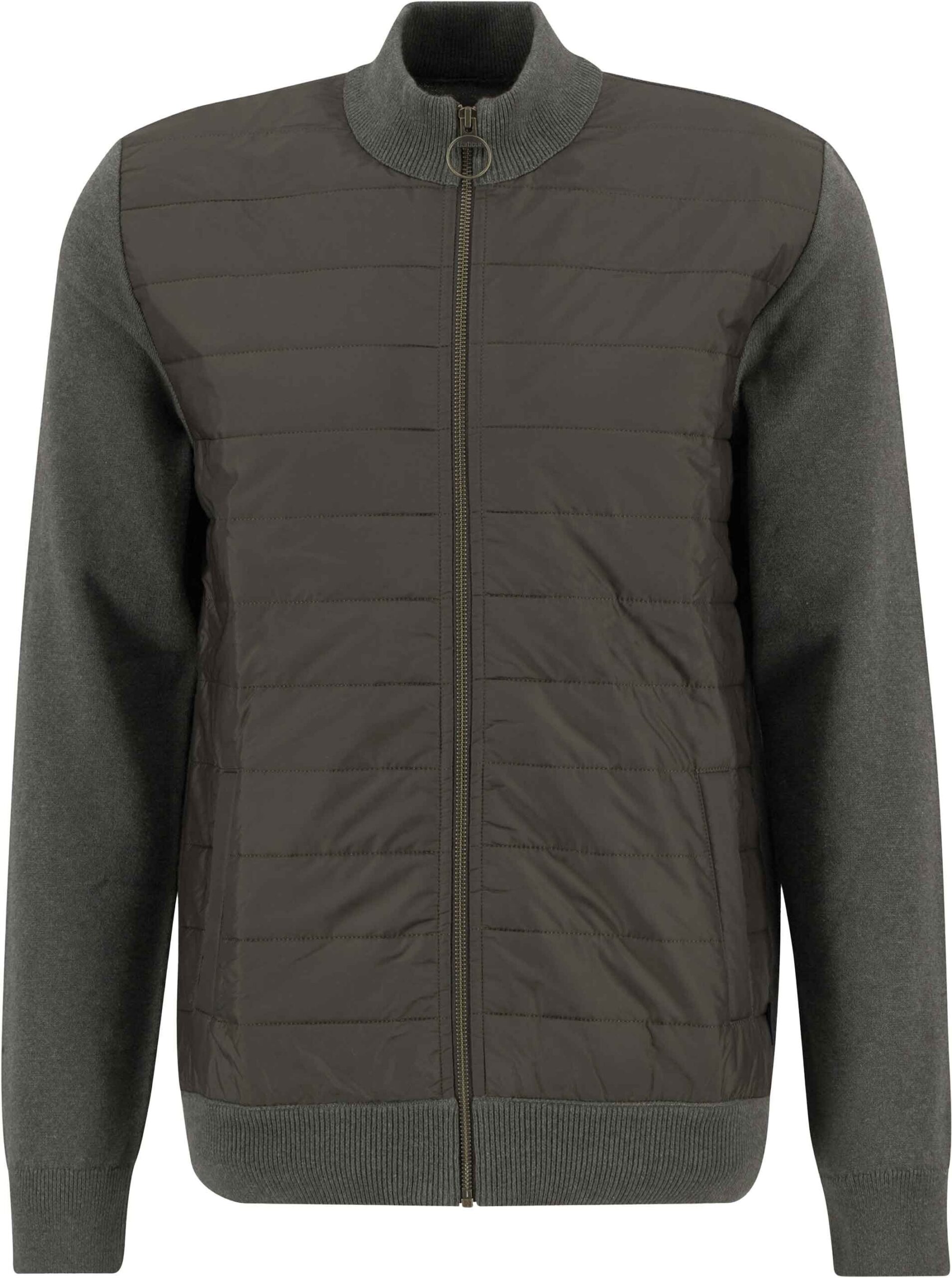 Gilet Barbour Essential Carn Baffle Zip Through Knitt Olive pour homme, alliant dos en tricot chaud, fermeture zippée intégrale et poches discrètes. Le panneau avant garni en polyester offre une isolation légère idéale en mi-saison ou en sous-couche hivernale.