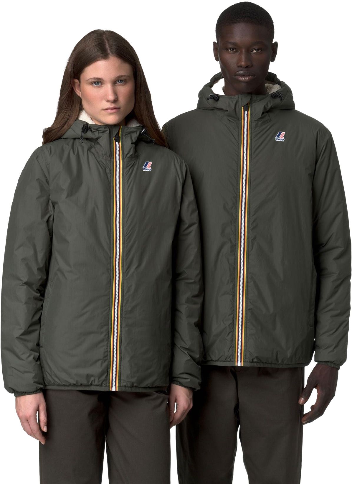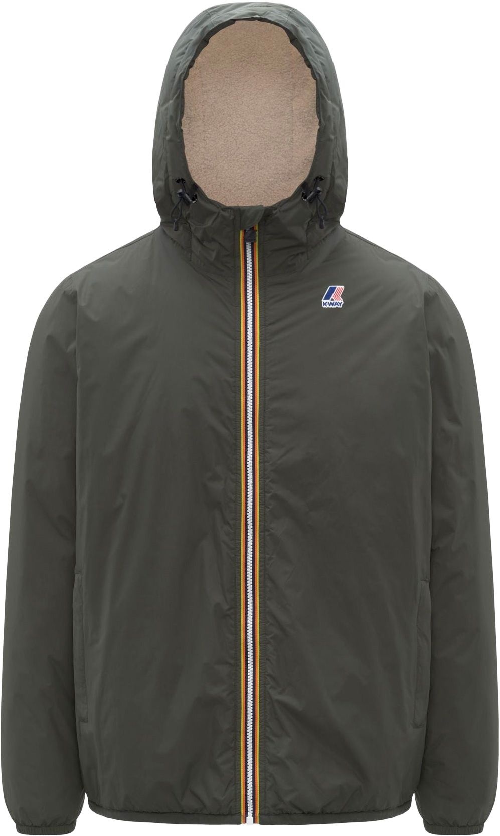 K-Way Le Vrai 4.0 Claude Orsetto Green Blackish : veste isolée coupe-vent imperméable en ripstop respirant, coutures thermocollées, rembourrage synthétique, doublure sherpa, ourlet et poignets ajustables, 2 poches zippées.