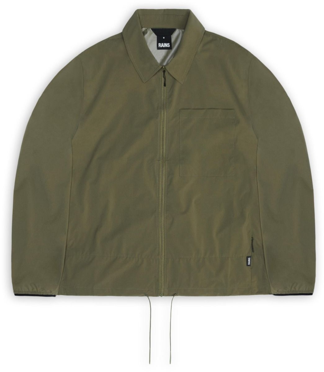 Une allure classique est assurée par la construction à col chemise, tandis que la fonctionnalité repose sur une fermeture éclair complète et des poignets ajustables par bande velcro. Les petits objets restent accessibles dans une poche poitrine, et la finition se distingue par un marquage caoutchouté signé Rains.
