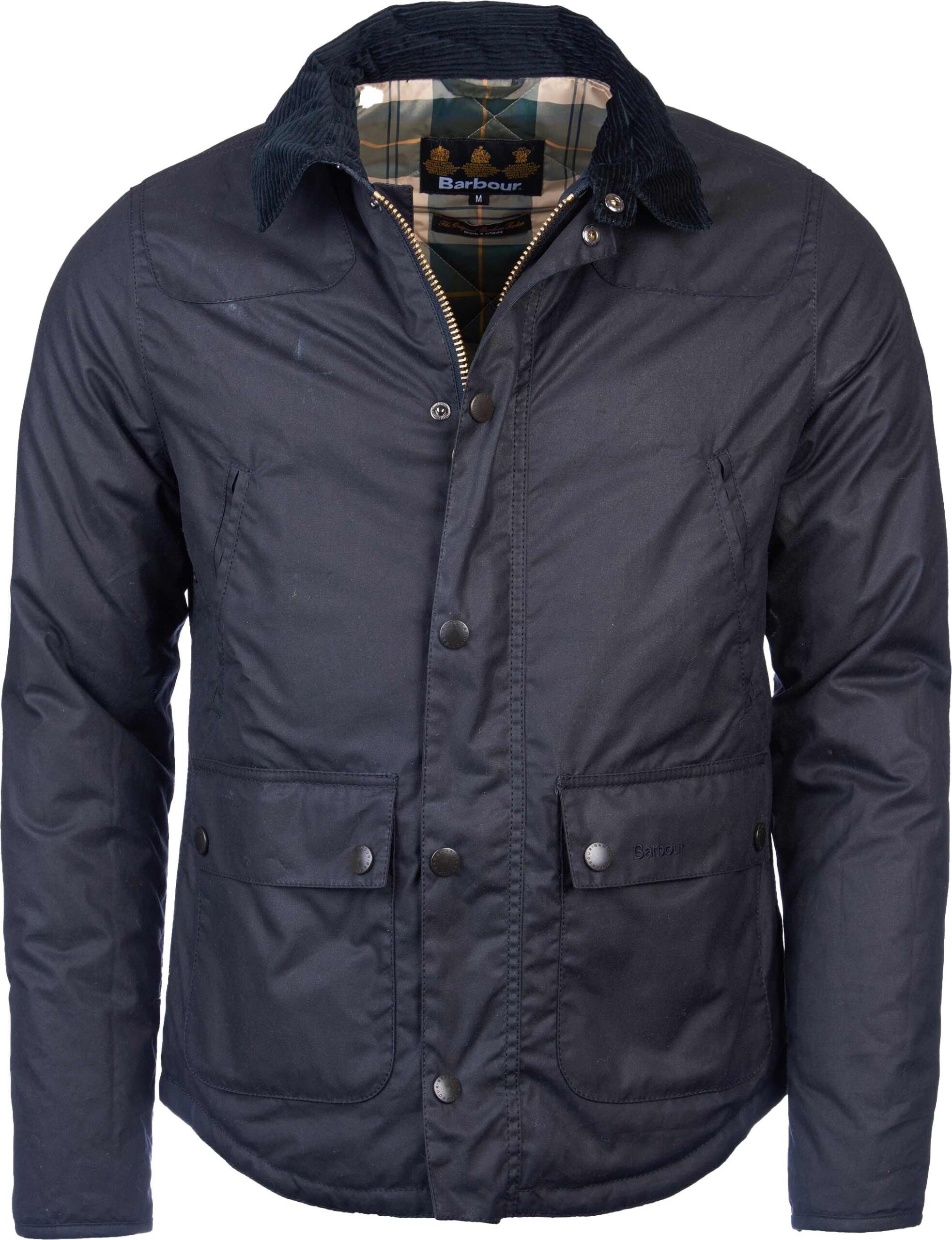 Veste Reelin Wax Jacket Navy pour homme, élégante et décontractée, en coton ciré avec col velours côtelé et doublure tartan British, prête à affronter l’hiver.