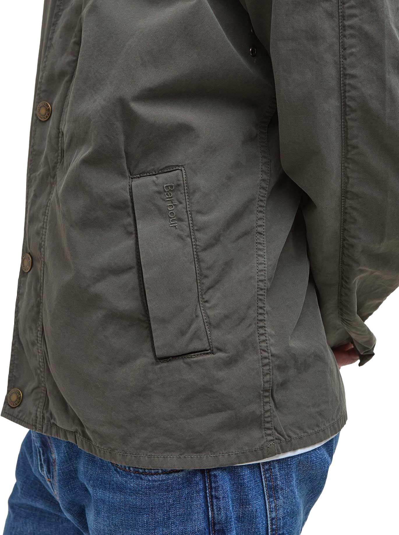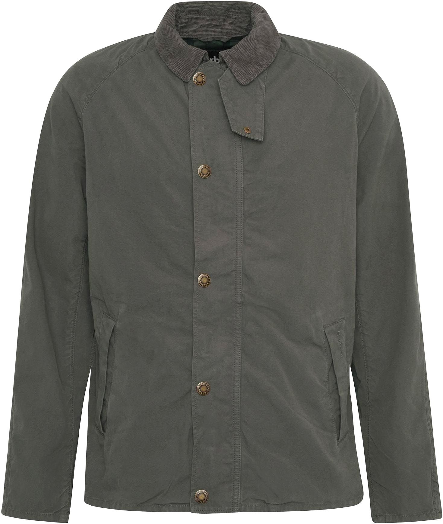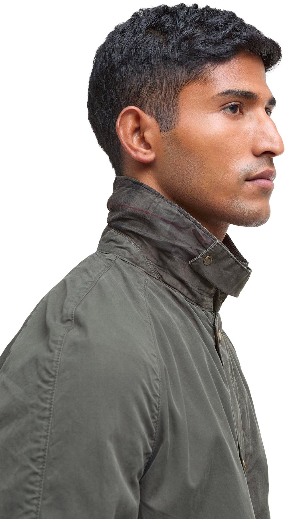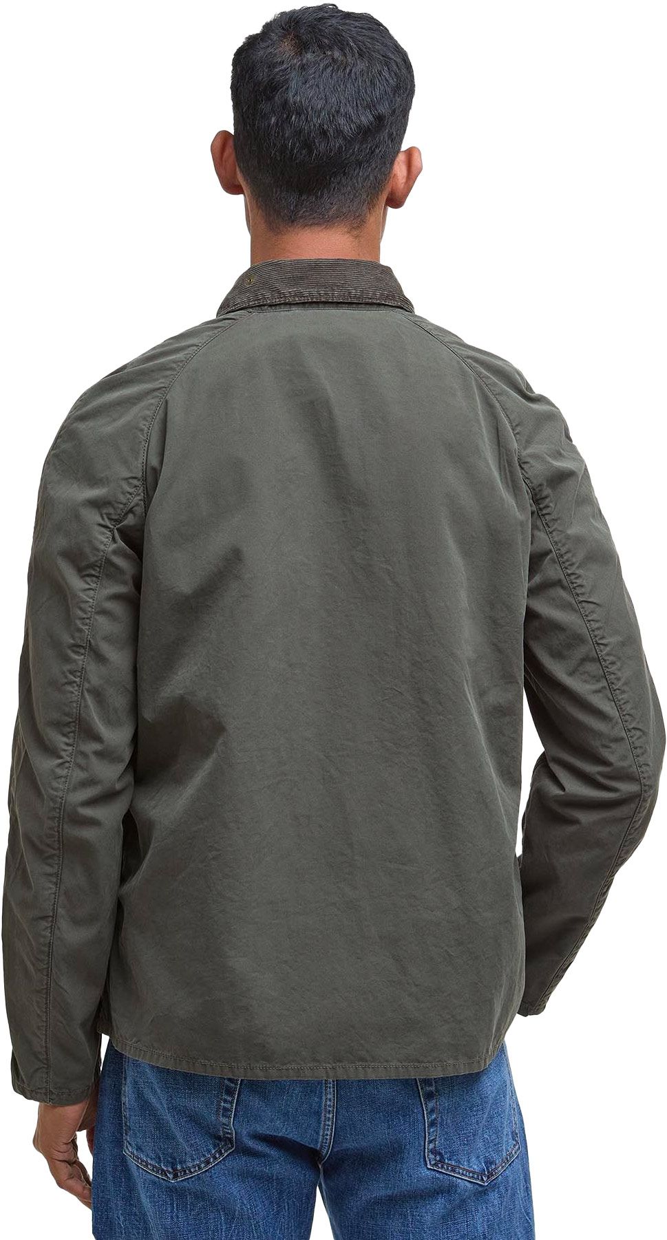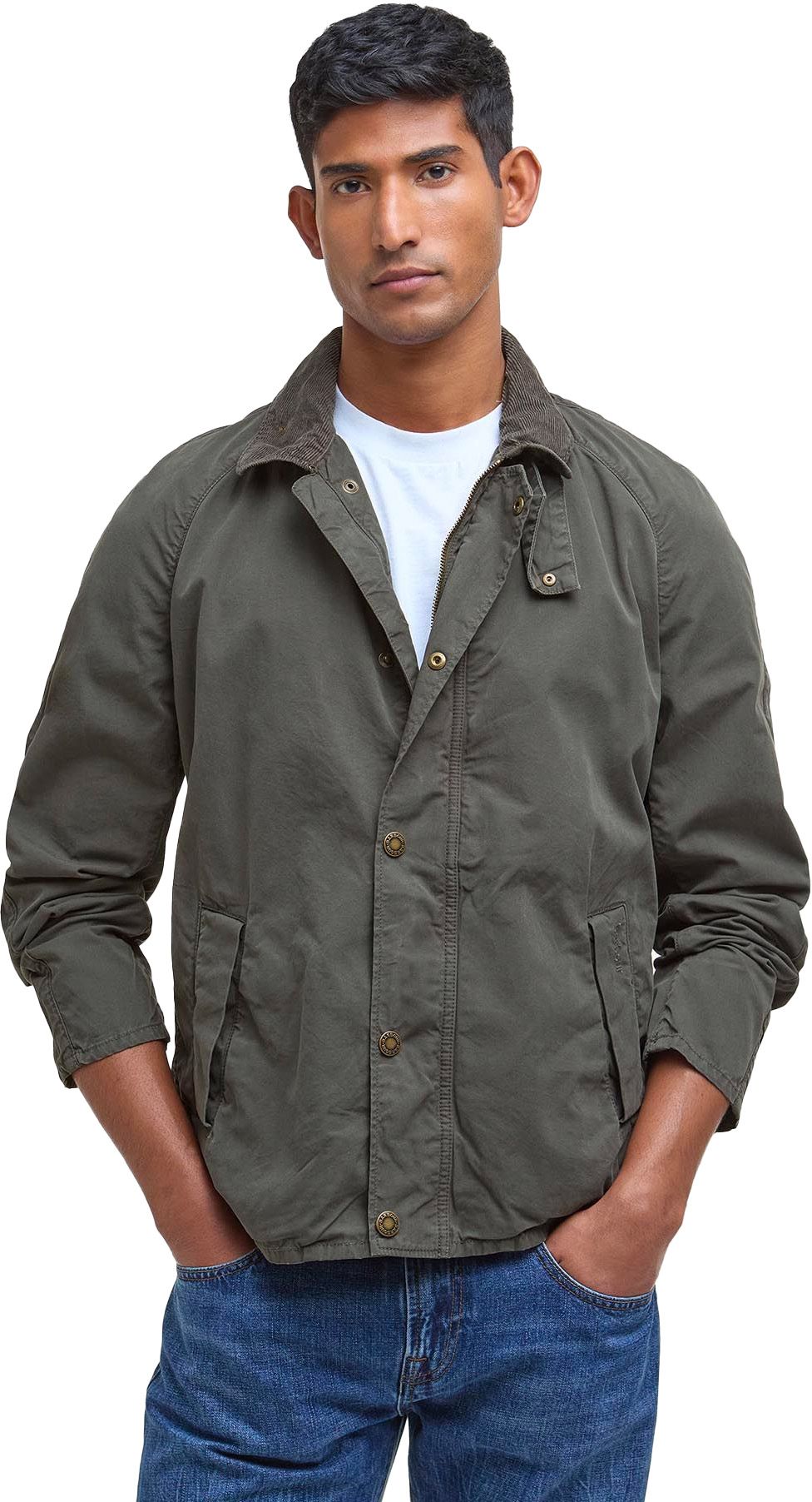 Blouson Tracker Casual Barbour homme en coton, col velours côtelé, sans doublure pour une légèreté optimale ; détail tartan intérieur et broderie discrète à la poche.